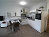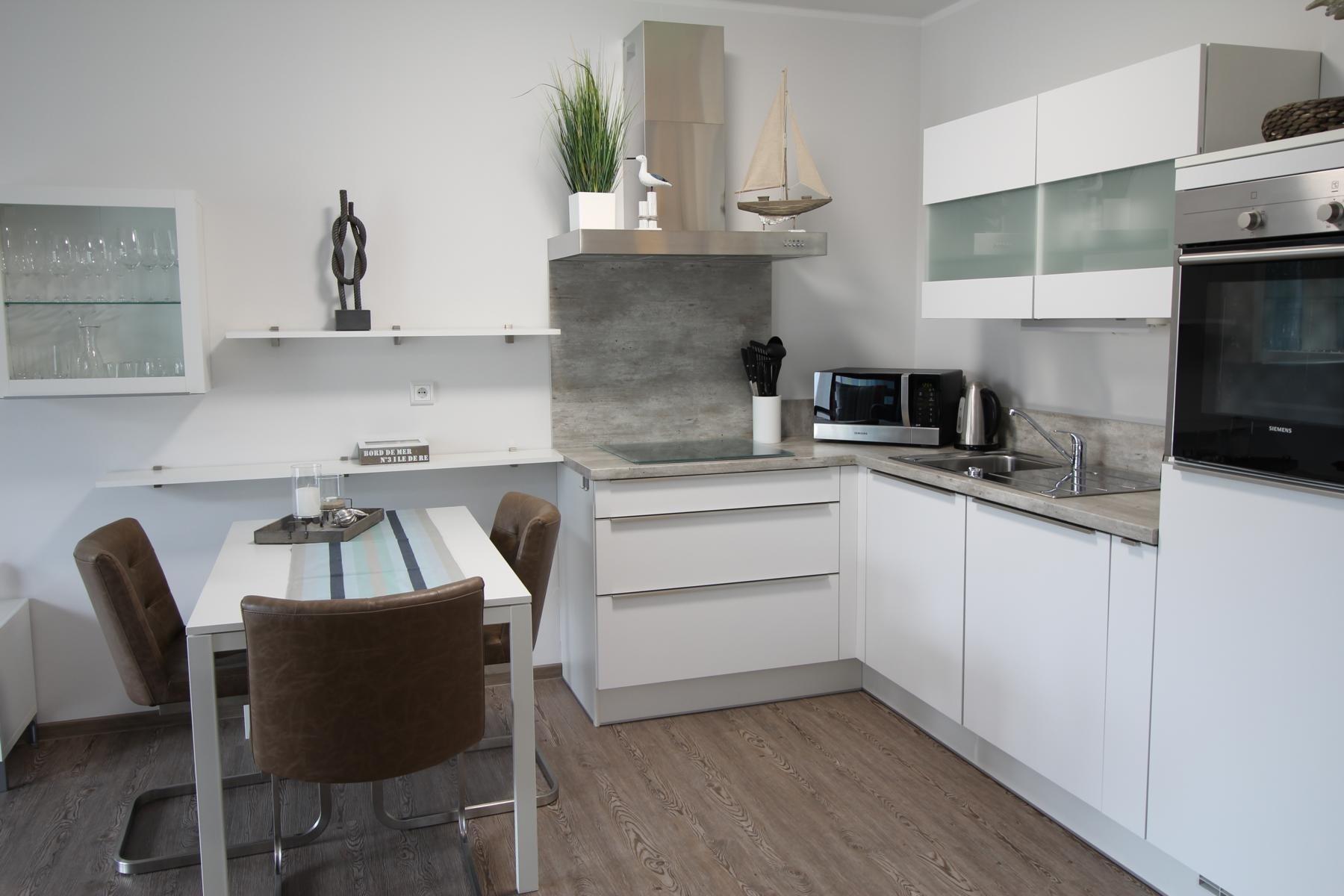 Die Einbauküche enthält einem Kühlschrank mit Gefrierfach, Herd mit Cerankochfeld sowie einem Backofen und einem Geschirrspüler. Weiterhin sind eine Mikrowelle, eine Kaffeemaschine, ein Wasserkocher und ein Toaster sowie hochwertiges Geschirr, Besteck und Gläser vorhanden.