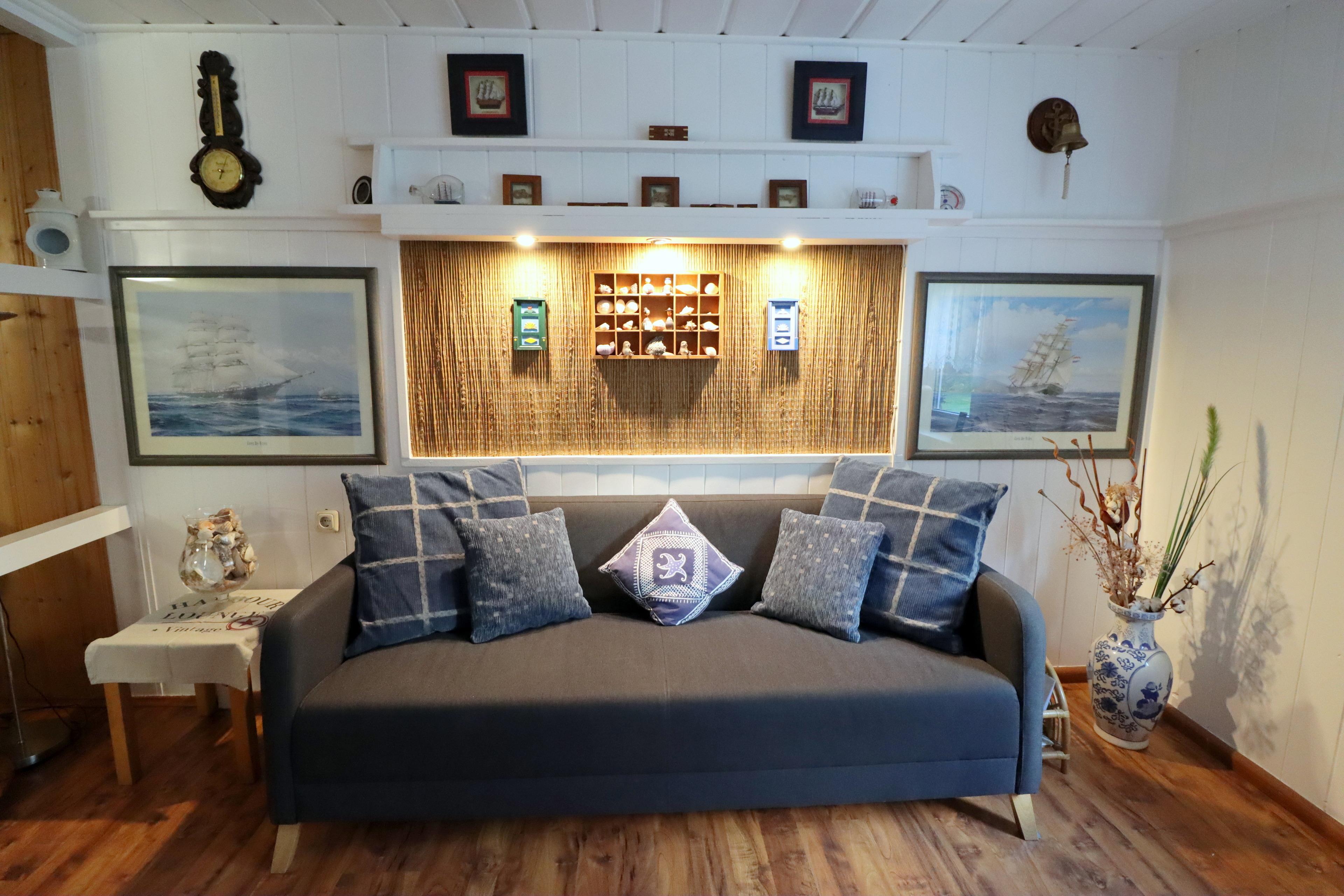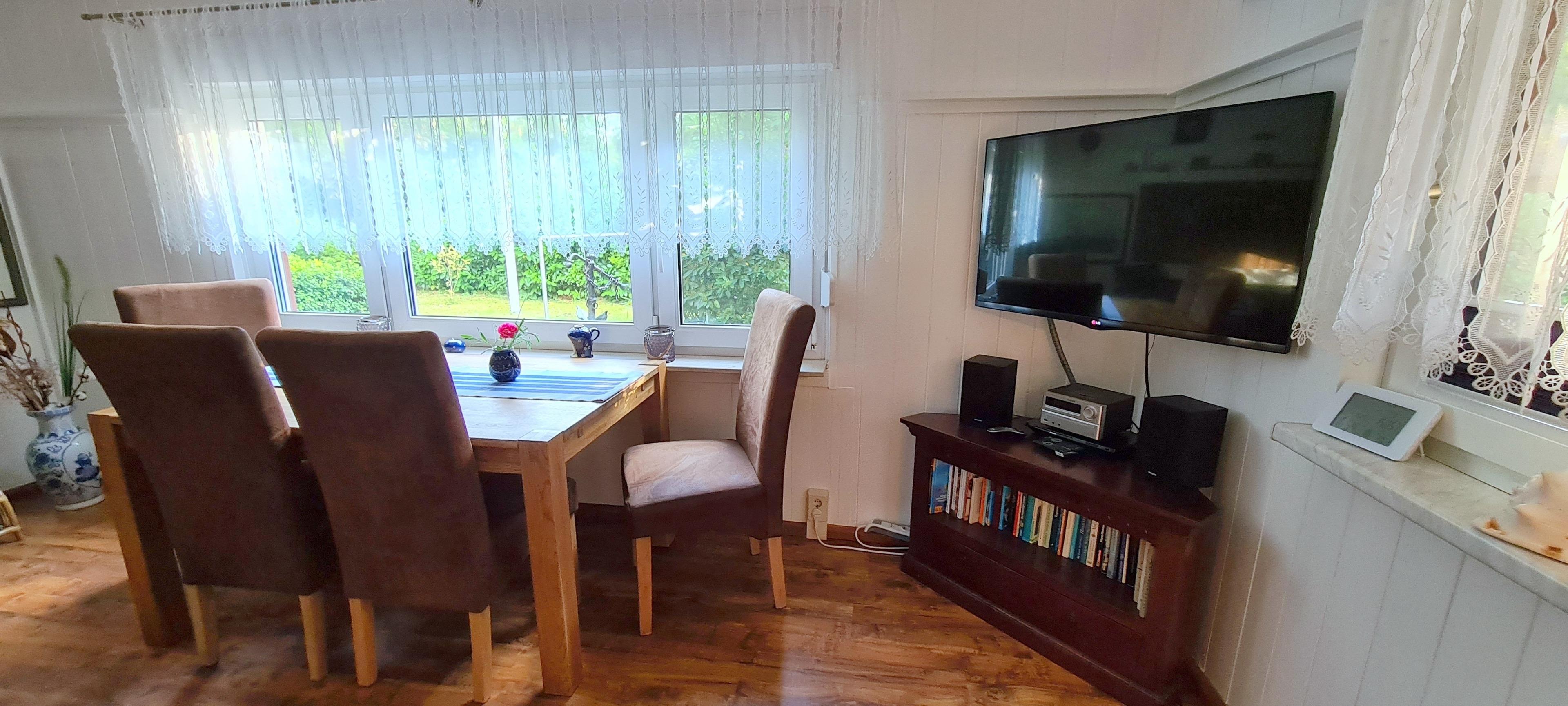 In dem gemütlich eingerichtetem Wohnzimmer stehen Ihnen ein LCD-TV, ein DVD Player, eine Stereoanlage mit CD, Bücher und div. Gesellschaftsspiele für Groß und Klein zur Verfügung. Auf gleicher Ebene befindet sich eine Küche, ausgestattet mit Kühlschrank (incl. Gefrierfach), Geschirrspüler, und div. Elektrogeräten (Kaffeemaschine, Wasserkocher, Toaster) und allem anderen was man so zum Kochen benötigt. Angrenzend befindet sich die Essecke für 6 Personen. Von hier haben Sie einen direkten Zugang zum Garten mit bequemen Gartenmöbeln und ein Gasgrill, wo Sie einen schönen Strandtag ausklingen lassen können. Das Bad befindet sich im EG. Im OG befinden sich zwei gemütlich eingerichtete Schlafzimmer, eines mit einem Doppelbett und eines mit zwei Einzelbetten.