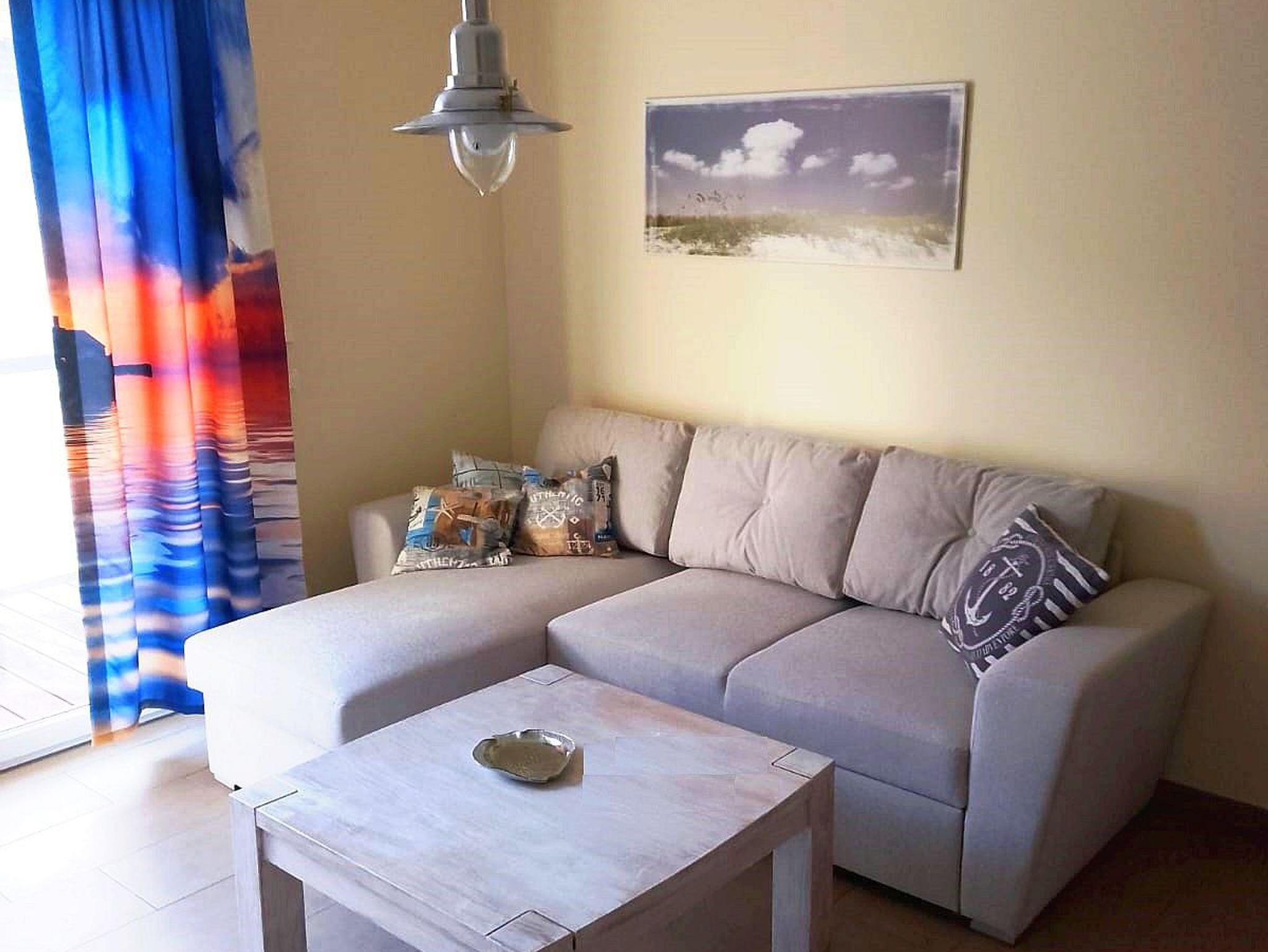 Das Appartement Nr. 5 ANKERPLATZ befindet sich im 1. Obergeschoß des Hauses 3 in der Appartementanlage Käpt n Brass. Das Appartement verfügt über 1 Schlafzimmer, ausgestattet mit einem Doppelbett (180x200) und einem 3-türigen Kleiderschrank, 1 Wohnzimmer mit integrierter Einbauküche, 1 Bad mit Dusche und Waschplatz. Im Wohnzimmer kann die Couch mit wenigen Handgriffen in ein Gästebett (180x220) verwandelt werden und bietet Platz zum Schlafen für 2 Personen.