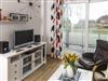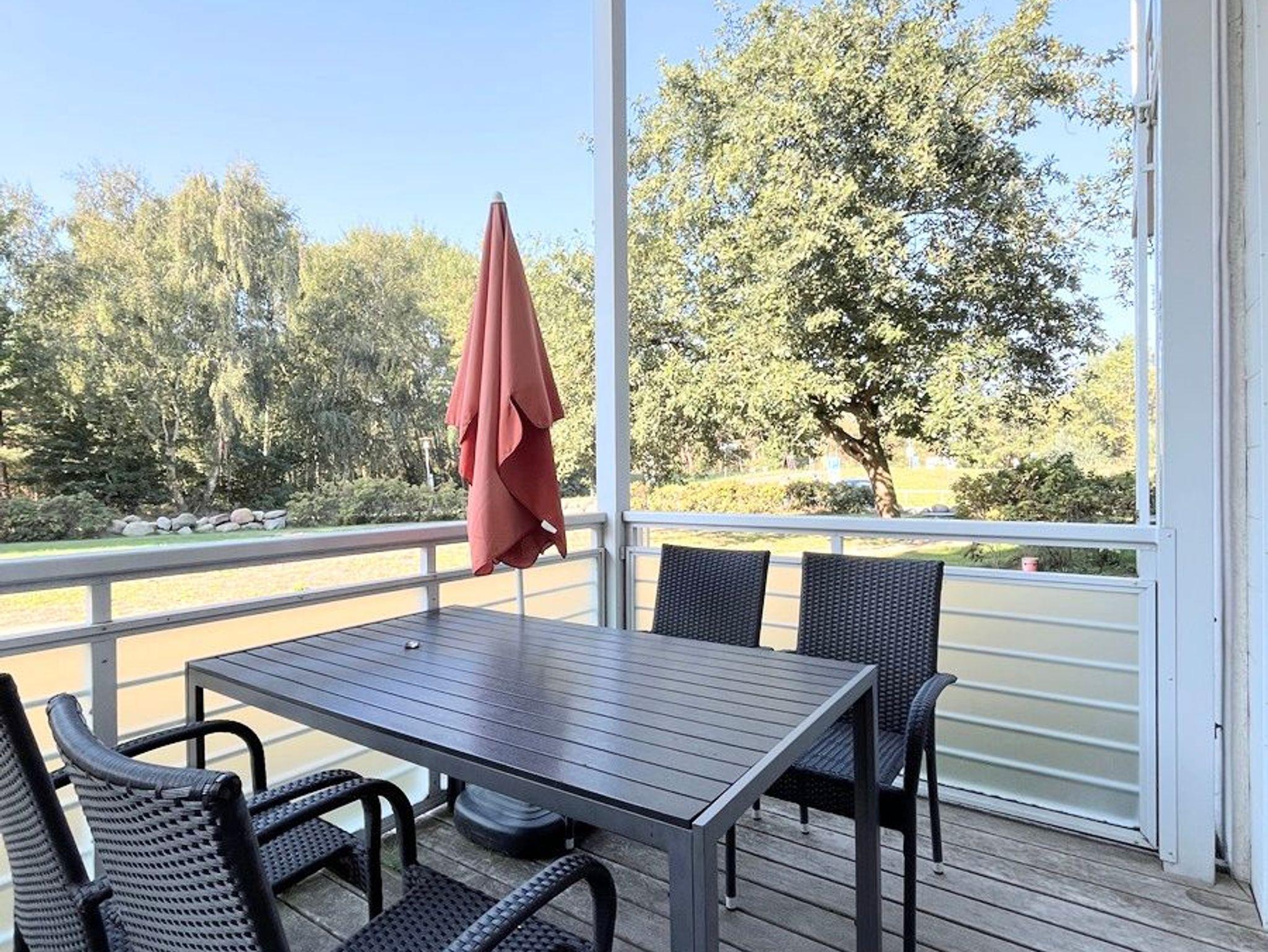 Die Wohnung befindet sich auf der Südseite im Erdgeschoss und ist ebenerdig begehbar. Die Einrichtung in hellen Farben ist freundlich und modern. Die großzügig überdachte Terrasse erstreckt sich über 2 Räume. Sie ist sowohl vom Schlafzimmer als auch vom Wohnzimmer aus zu erreichen. Die bodenhohen Fenster sorgen für lichtdurchflutete Räume. Wenn Ihnen die Sonne doch einmal zu viel wird, können die vorhandenen Außenjalousien die Räume verdunkeln.