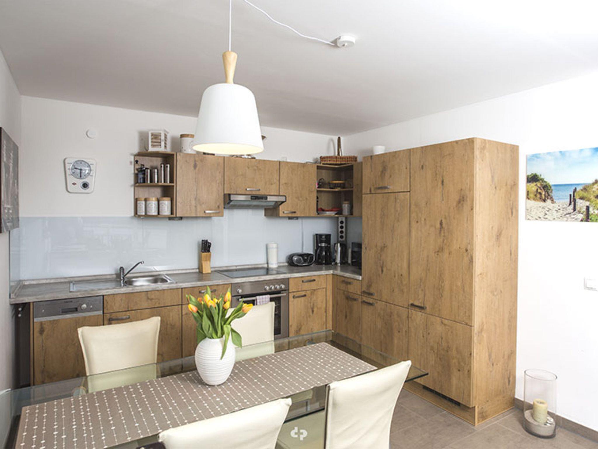 • Die hochwertige Einbauküche ist mit Cerankochfeld, Backofen, Geschirrspüler, Kühlschrank mit Gefrierfach, Kaffeemaschine, Wasserkocher, Toaster sowie ausreichend Geschirr und Besteck ausgestattet.