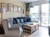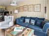 Der Wohnbereich ist mit maritimen Möbeln, einer Couch mit passendem Sessel und TV ausgestattet.