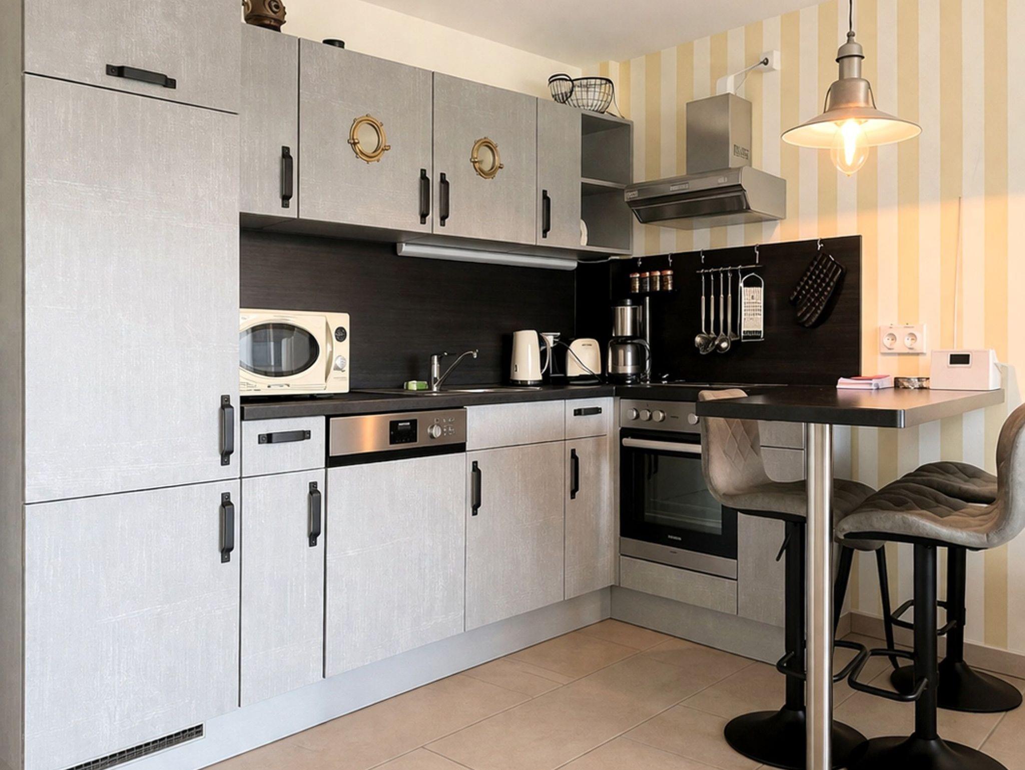 • Vom Eingangsbereich gelangen Sie in den Wohnbereich mit integrierter Einbauküche. Die hochwertige Einbauküche ist mit Cerankochfeld, Backofen, Geschirrspüler, Kühlschrank mit Gefrierfach, Mikrowelle, Kaffeemaschine, Wasserkocher, Toaster sowie ausreichend Geschirr und Besteck ausgestattet. Am Esstisch finden bequem 3 Personen Platz.