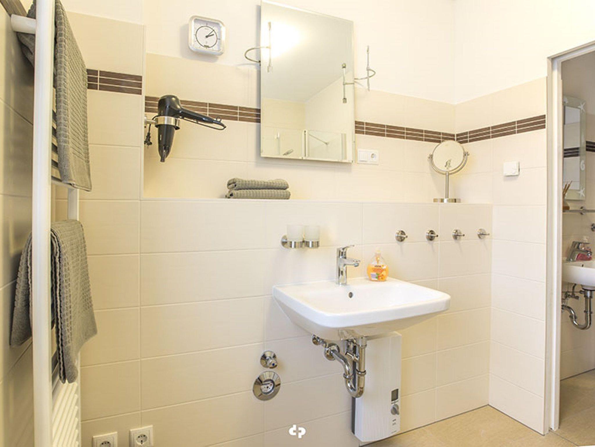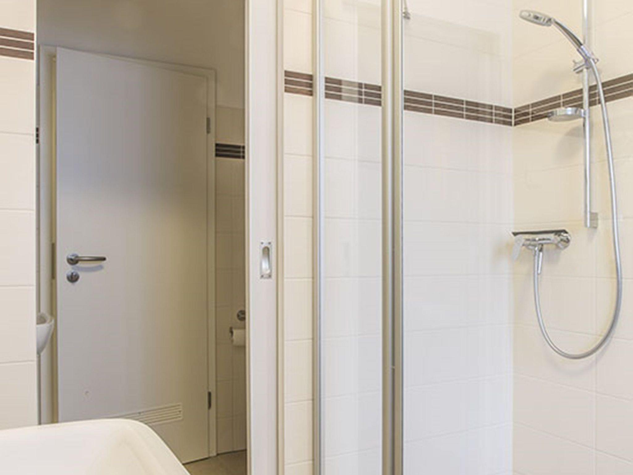 • Das Duschbad verfügt über eine geräumige Glasdusche, einen Waschplatz, einen Handtuchheizkörper, eine Waschmaschine und einen Fön. Das separate WC mit Waschbecken ist sowohl vom Eingangsbereich als auch vom Duschbad aus begehbar.