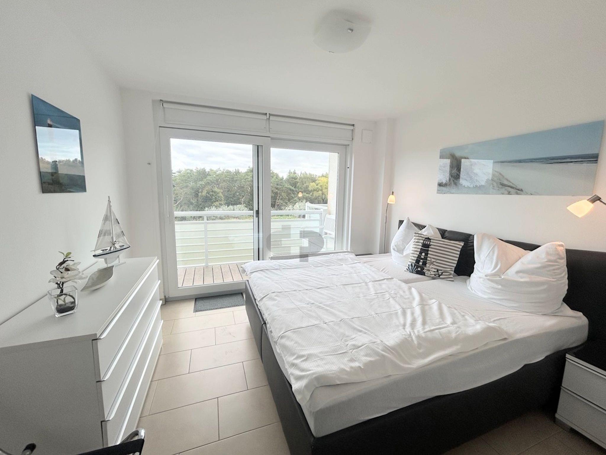 Das Schlafzimmer ist mit einem Doppelbett mit 2 Matratzen, Kleiderschrank und einer Kommode ausgestattet. Der Wohnbereich ist mit modernen Möbeln, einer Schlafcouch und TV ausgestattet.