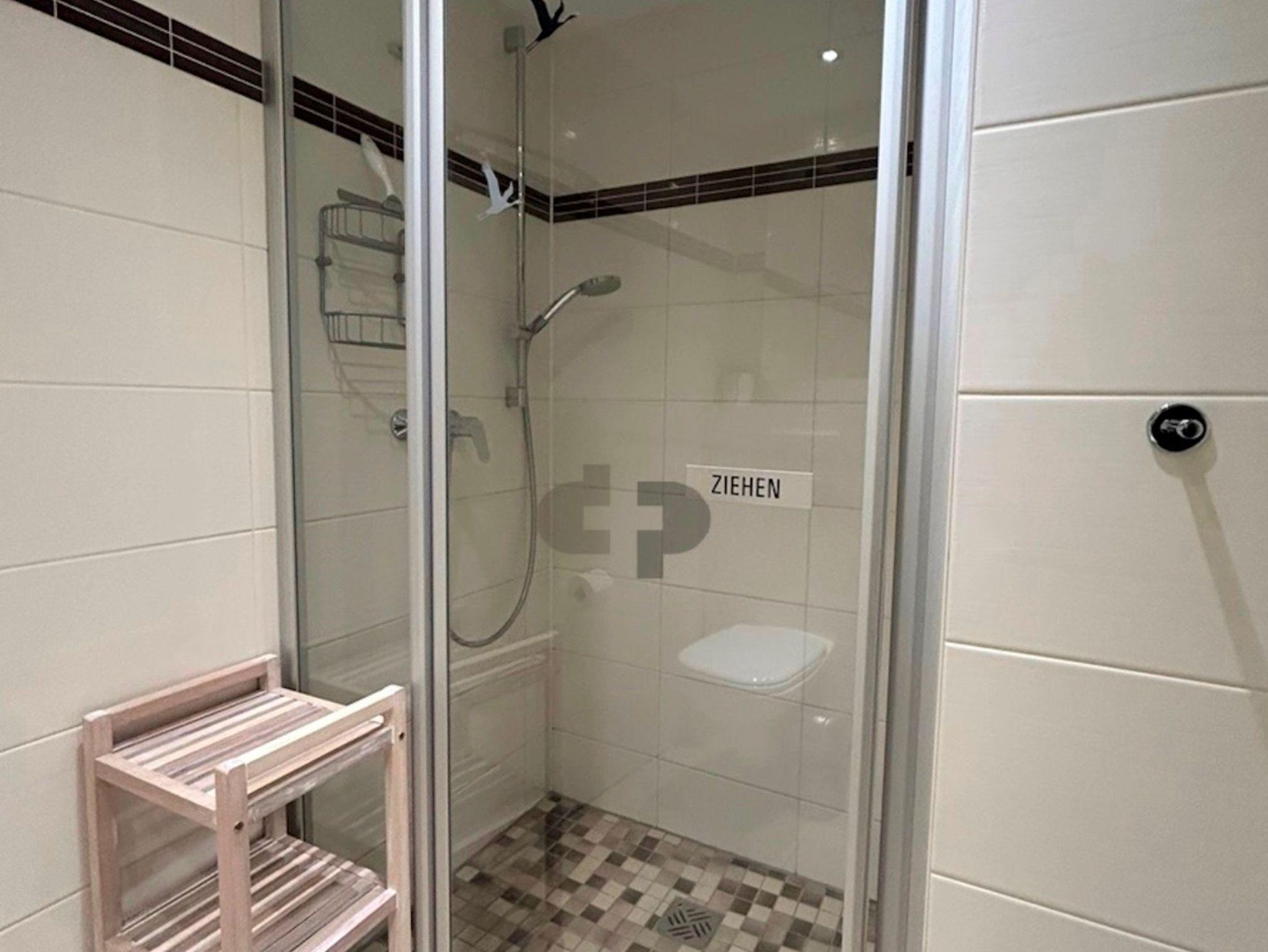 Das Bad verfügt über eine großzügige, ebenerdige Dusche, einen Waschplatz einem Handtuchheizkörper und einem WC.