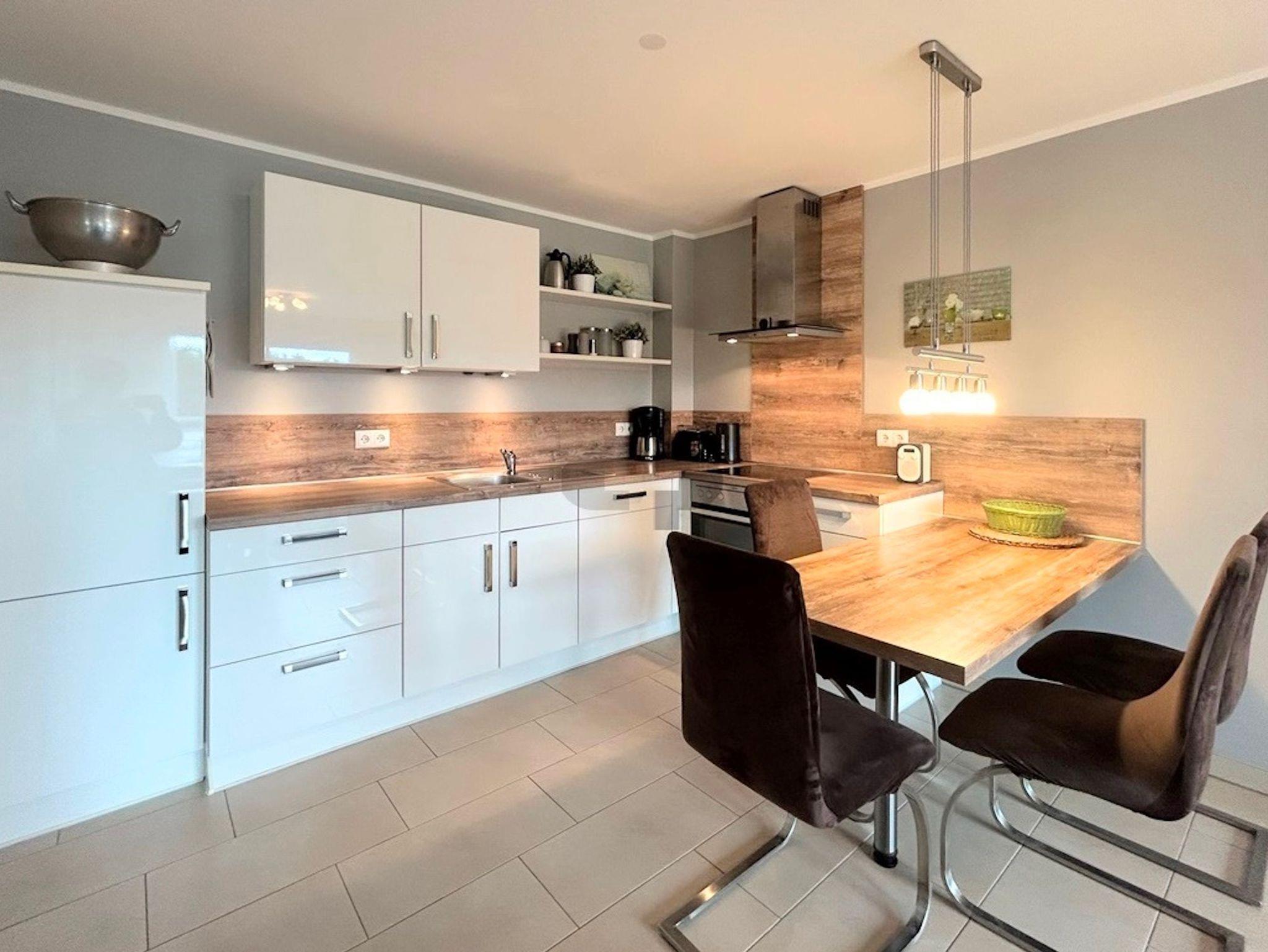 Vom Eingangsbereich betreten Sie den Wohnbereich mit integrierter Einbauküche. Die hochwertige Einbauküche ist ausgestattet mit Ceranfeld, Backofen, Geschirrspüler, Kühlschrank mit Gefrierfach, Kaffeemaschine, Wasserkocher, Toaster und selbstverständlich ausreichend Geschirr und Besteck.