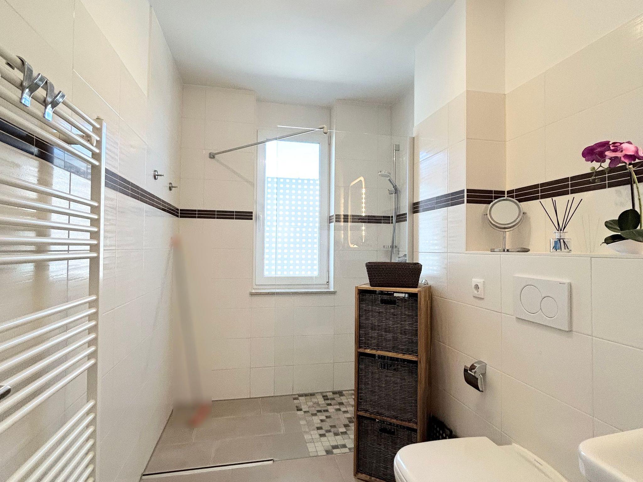 • Das Bad verfügt über eine großzügige ebenerdige Dusche, einem Waschtisch, WC, Fön und Handtuchheizkörper.