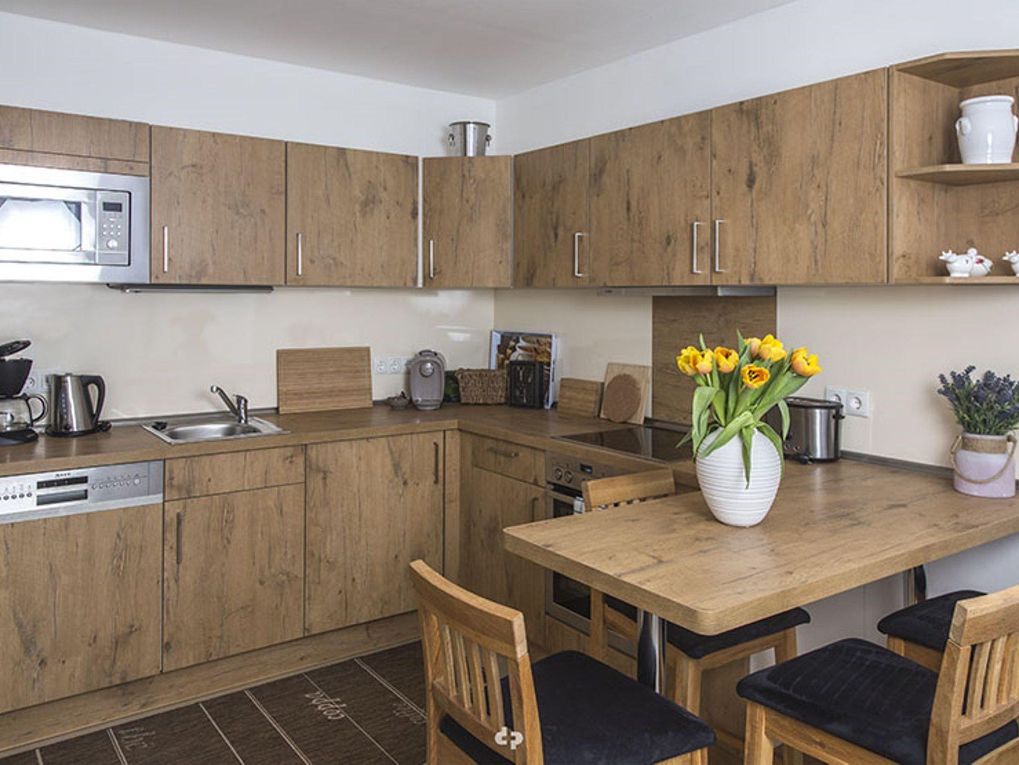 • Die hochwertige Küche ist mit Cerankochfeld, Backofen, Geschirrspüler, Kühlschrank mit Gefrierfach, Kaffeemaschine, Wasserkocher, Toaster sowie ausreichend Geschirr und Besteck ausgestattet.