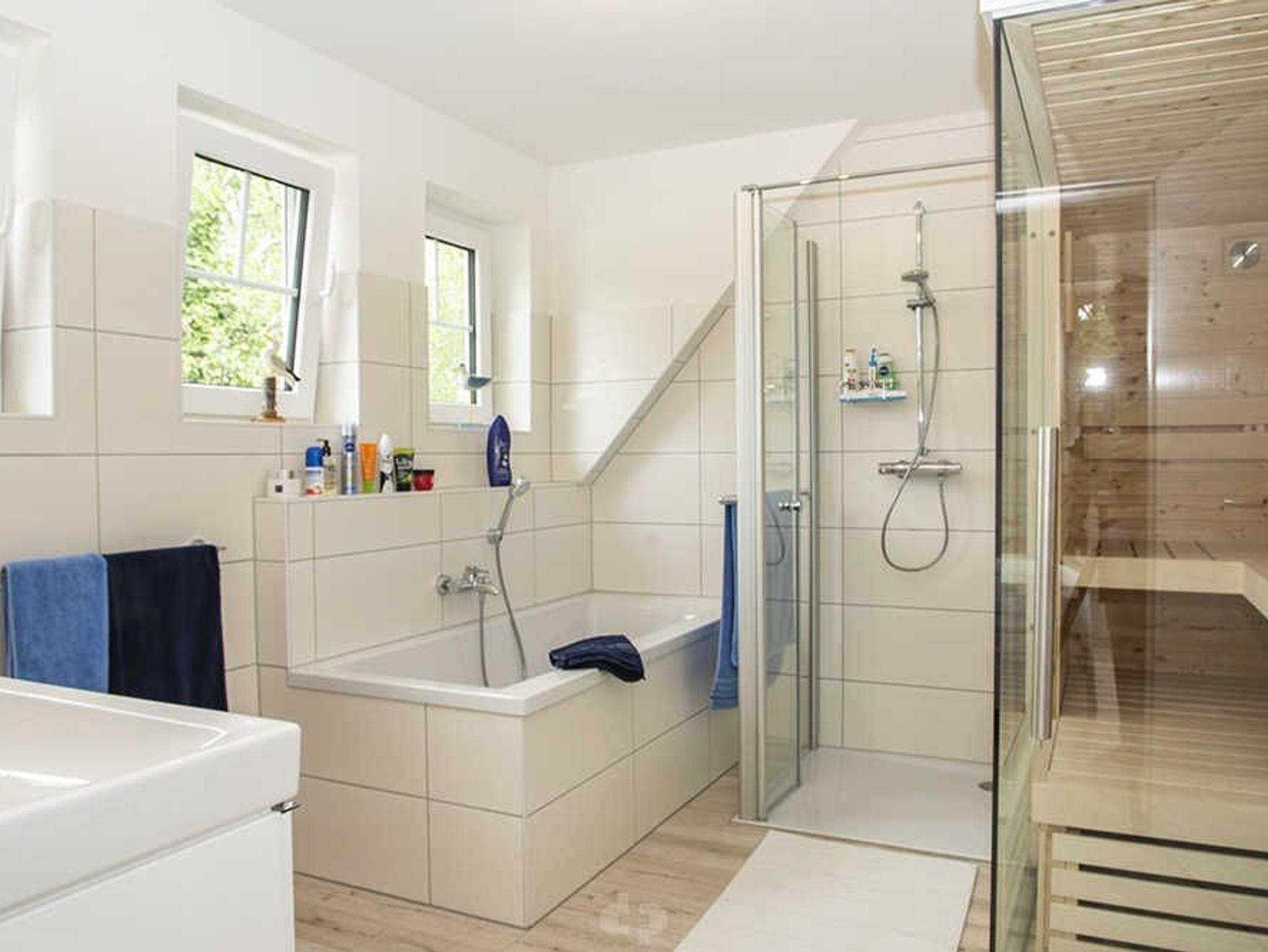 DACHGESCHOSS: 2 Schlafzimmer mit Doppelbetten, HIGHLIGHT ? im Badzimmer integrierte Bio- und finnische Sauna.