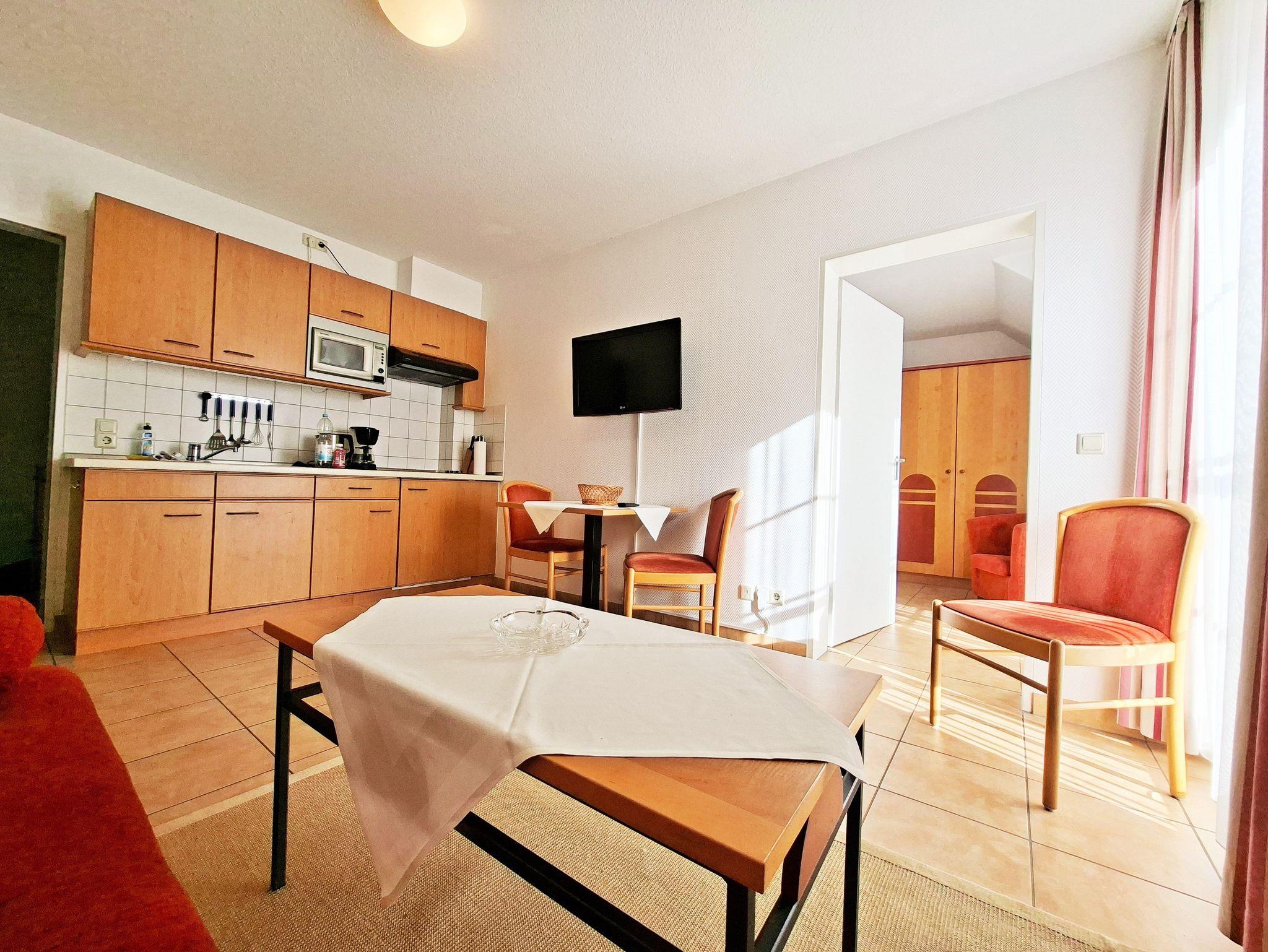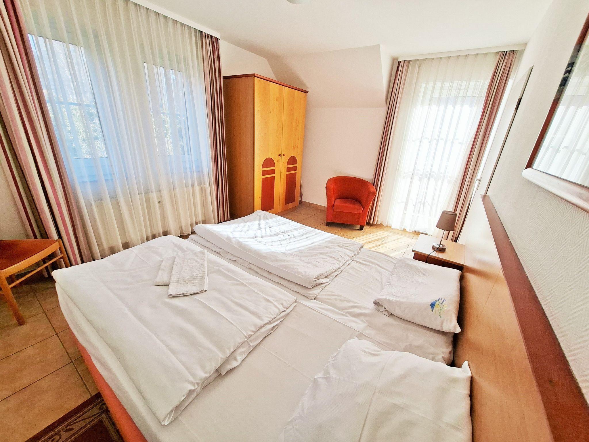 Die modern eingerichteten 2-Raum-Appartements dieser Kategorie sind für maximal 4 Personen geeignet und ca. 38 qm groß. Sie verfügen über einen Wohn-/Schlafraum mit Schlafcouch für 2 Personen und ein separates Schlafzimmer (Doppelbett oder 2 Einzelbetten). Alle unsere Wohnungen sind Nichtraucher-Wohnungen. Bei einigen Appartements können Sie Ihr Haustier mitbringen (s. Zimmerdaten). Ausstattung: Sat-TV, Radio, Küchenzeile, Dusche/WC, möblierte Terrasse oder Balkon. Bettwäsche und Handtücher als Erstausstattung.