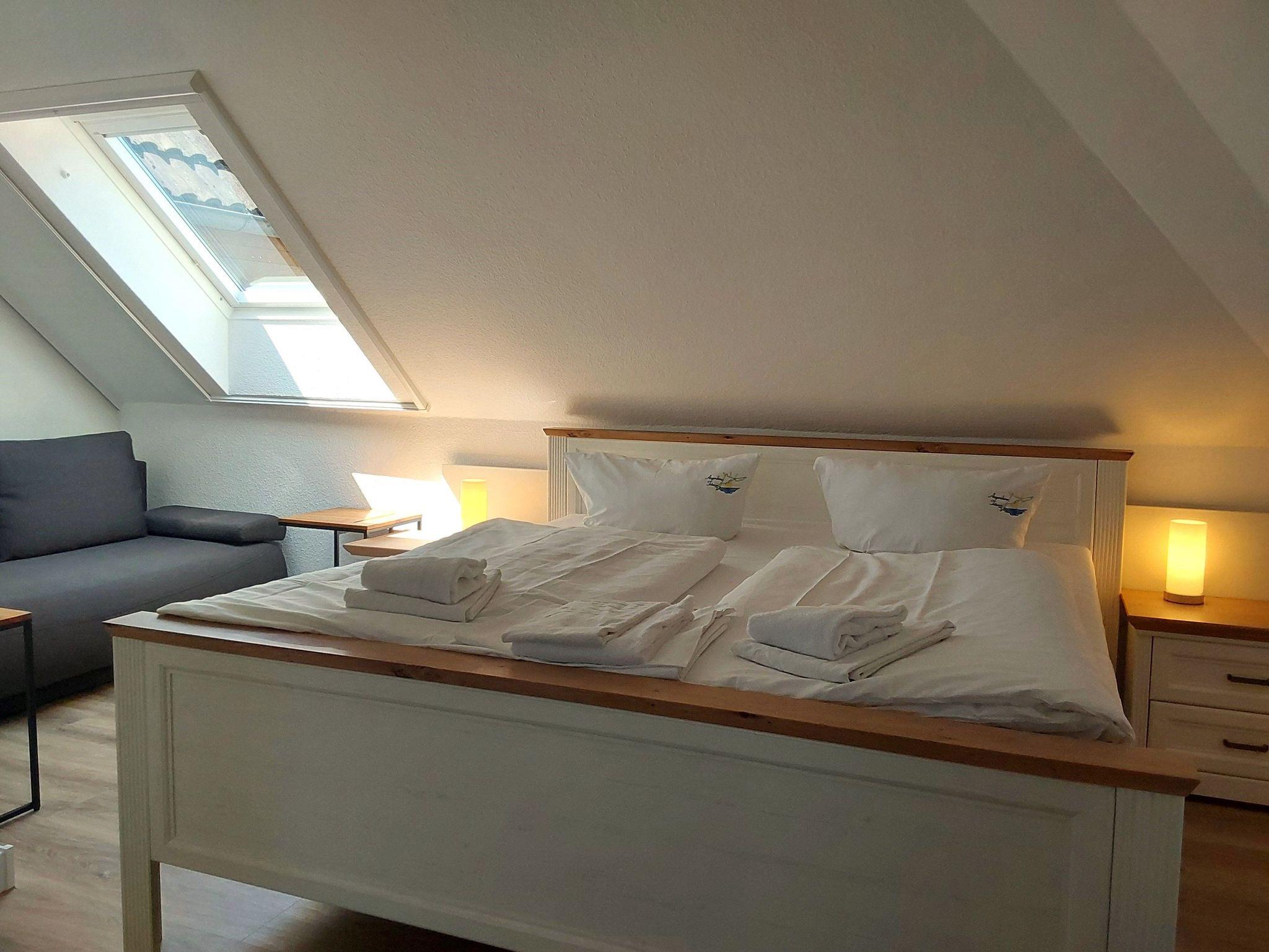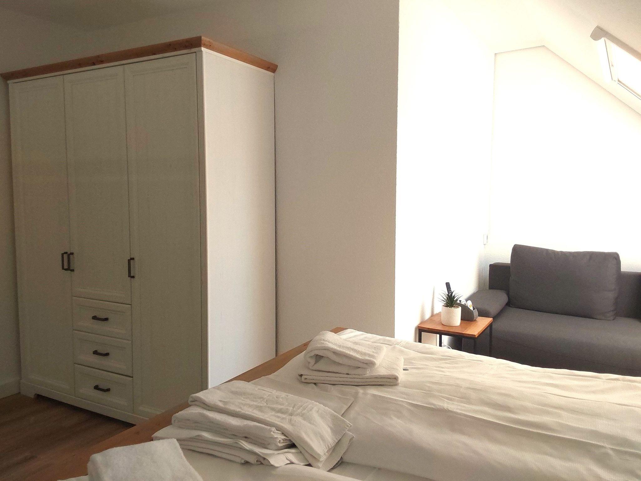 Die modern eingerichteten 2-Raum-Appartements dieser Kategorie sind für maximal 4 Personen geeignet und ca. 38 qm groß. Sie verfügen über einen Wohn-/Schlafraum mit Schlafcouch für 2 Personen und ein separates Schlafzimmer (Doppelbett oder 2 Einzelbetten). Alle unsere Wohnungen sind Nichtraucher-Wohnungen. Bei einigen Appartements können Sie Ihr Haustier mitbringen (s. Zimmerdaten). Ausstattung: Sat-TV, Radio, Küchenzeile, Dusche/WC, möblierte Terrasse oder Balkon. Bettwäsche und Handtücher als Erstausstattung.