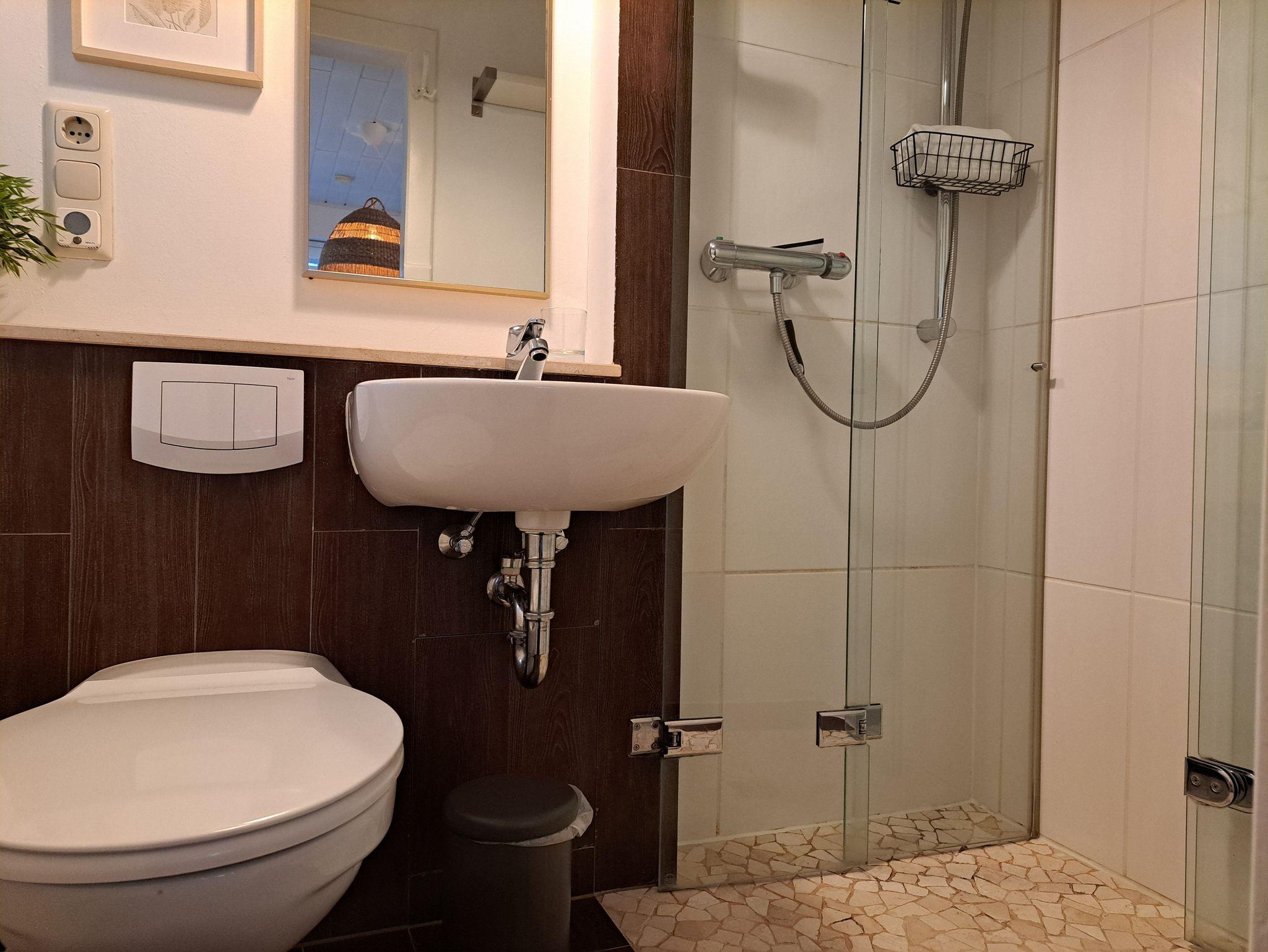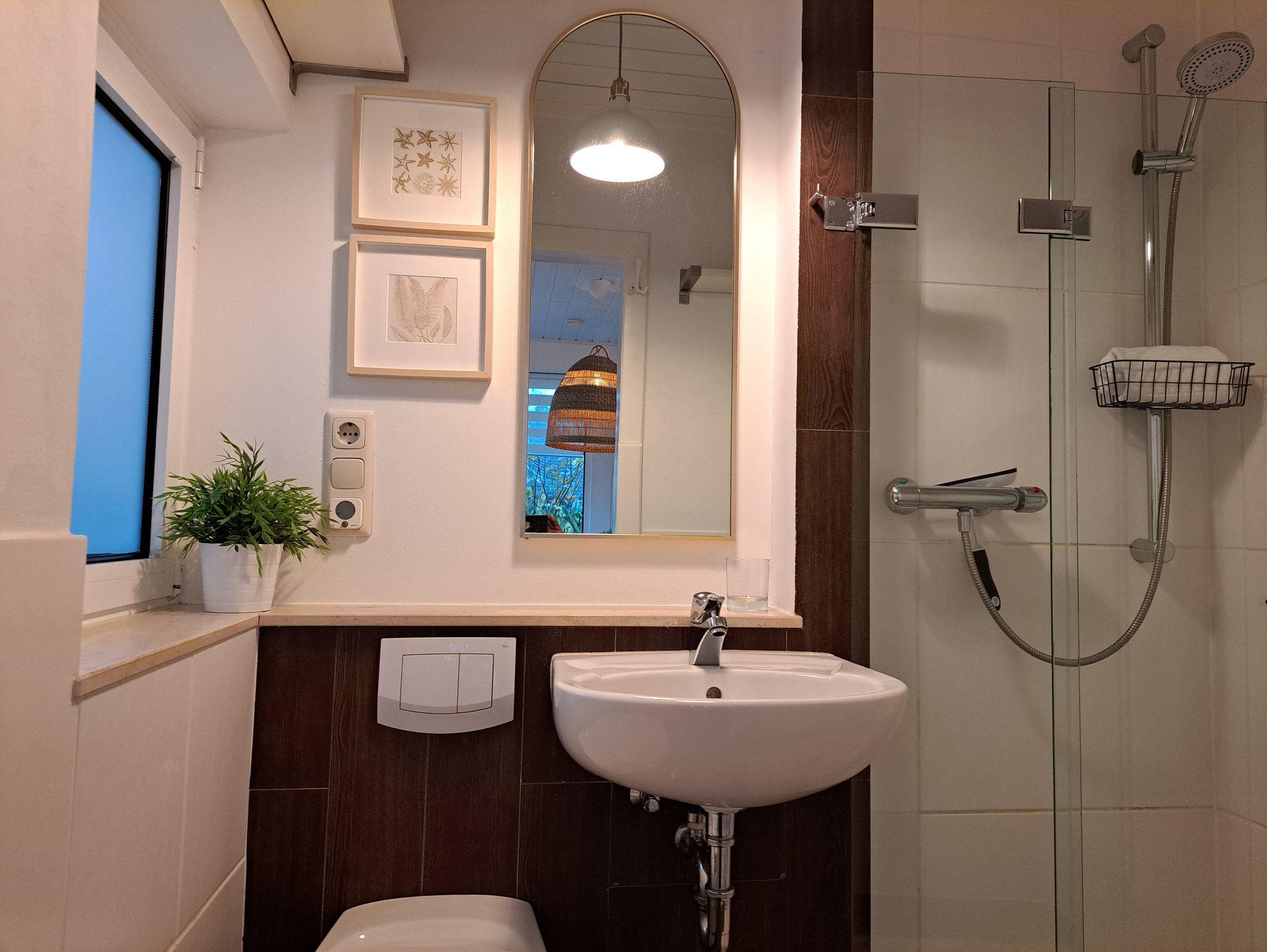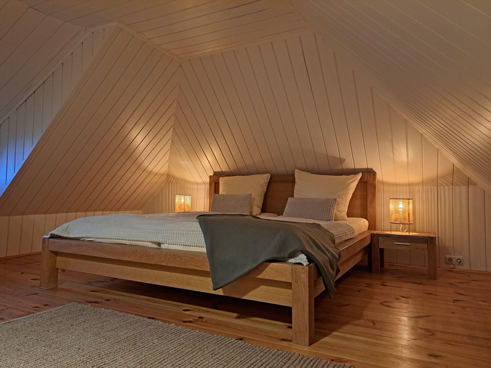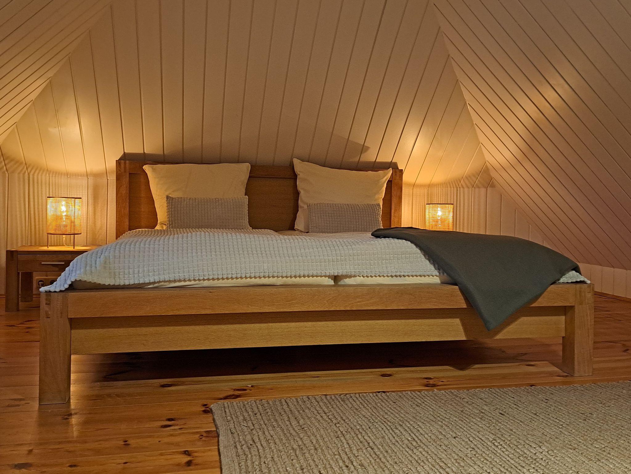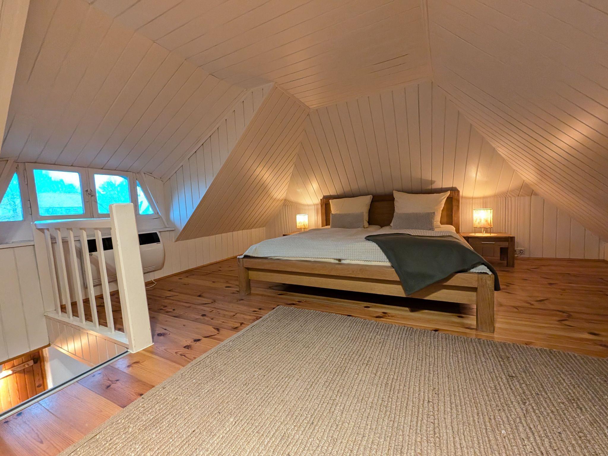 Das qualitativ hochwertig eingerichtete Badezimmer mit ebenerdiger Dusche bietet vielseitige Möglichkeiten für Wellness und Entspannung. Direkt im Dachgiebel des Ferienhauses an der Ostsee befindet sich das modern eingerichtete Schlafzimmer inklusive Doppelbett für zwei Personen mit einer Größe von 1,80 x 2,00 m (getrennte Matratzen), Deckenhöhe ca. 1,80 m. Ebenso steht ein Reisebett für ein Kleinkind bereit. Dank der Konvektorenheizung bietet das Ferienhaus in Dierhagen auch zu kalten Jahreszeiten eine gemütliche Wärme. Nichtraucher, WLAN, keine Haustiere.