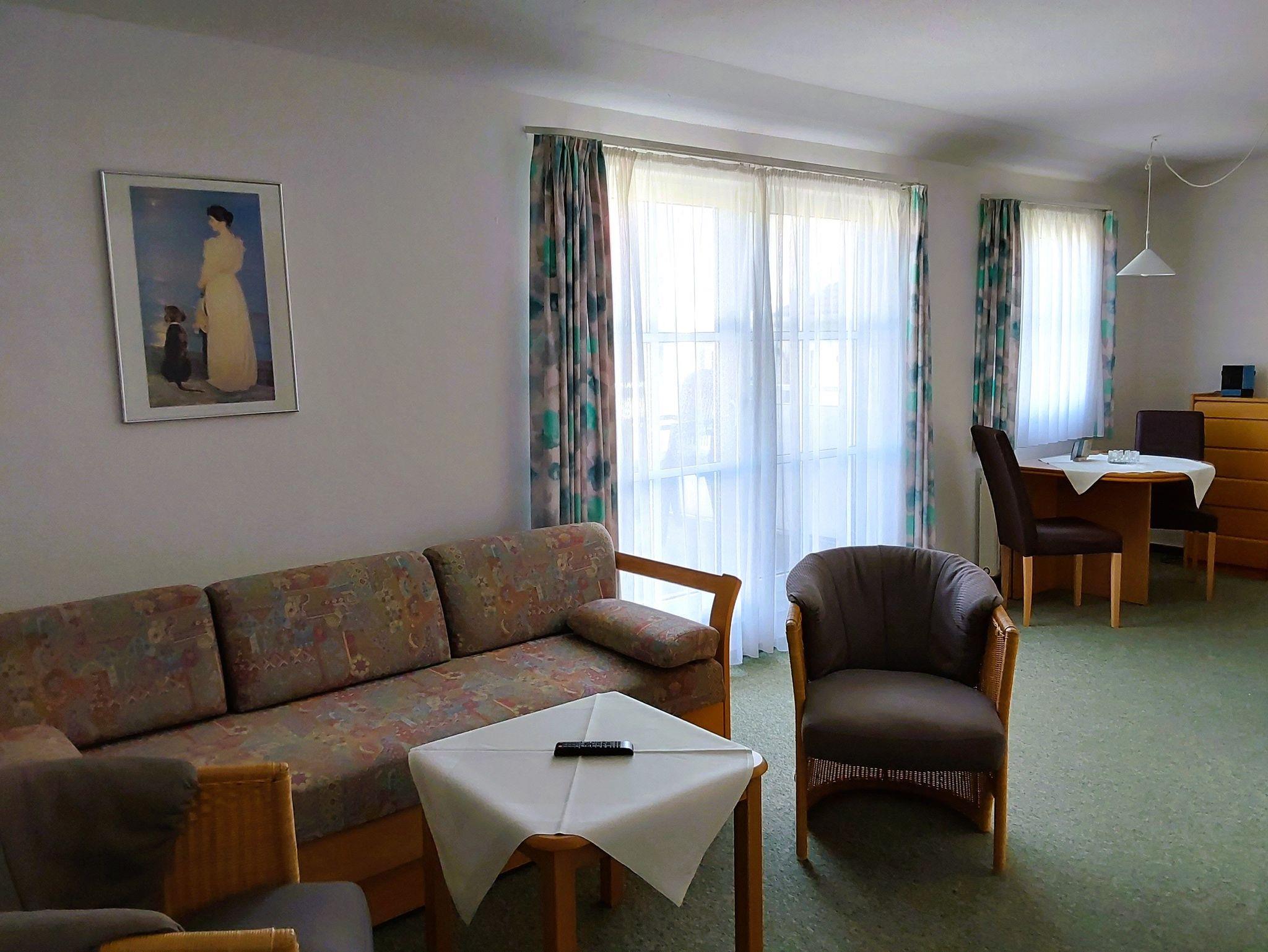 Die FEWO ist für zwei Personen üppig groß und insgesamt gut ausgestattet. Die fehlende Spülmaschine fällt bei zwei Personen kaum ins Gewicht, das fehlende W-Lan ist nicht mehr zeitgemäß. Auch die weißen Plastikstühle auf den Balkonen sollten einmal erneuert werden.