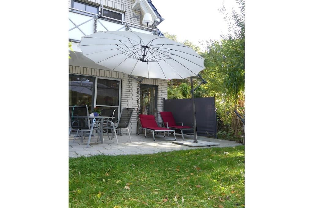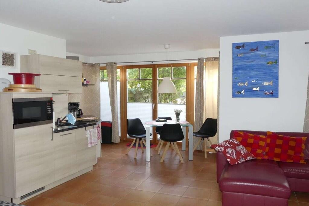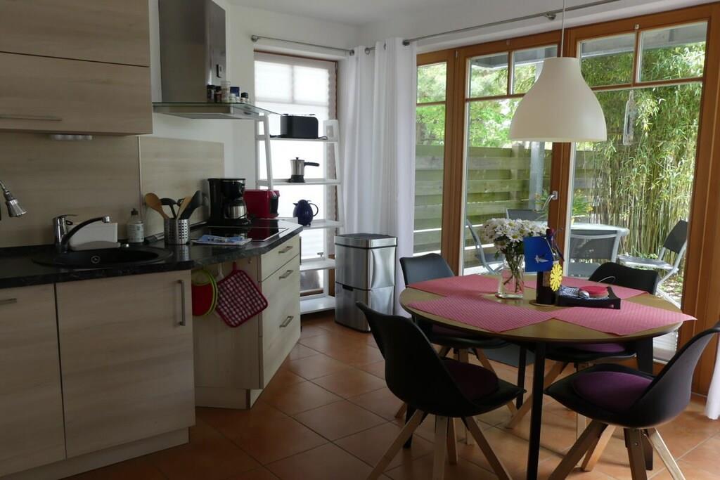 Arrive at any time of year and feel at home in Dierhagen-Strand. Due to its SW orientation, Dünennest 2 is in the sun all day. The apartment has a living-dining area with an open, well-equipped kitchen. A bedroom with a double bed 200x160 and a second sleeping area in the living room in a wall-folding bed 200x160. The apartment has two terraces, one of which is covered, and a garden. A high chair as well as games and art supplies are waiting for the little ones. 100 meters through the wild, romantic coastal forest and you are on the kilometer-long sandy beach. A beach tent, windbreak and beach chairs are on site. Two island bicycles are also available. A patio heater is available for cool evenings.