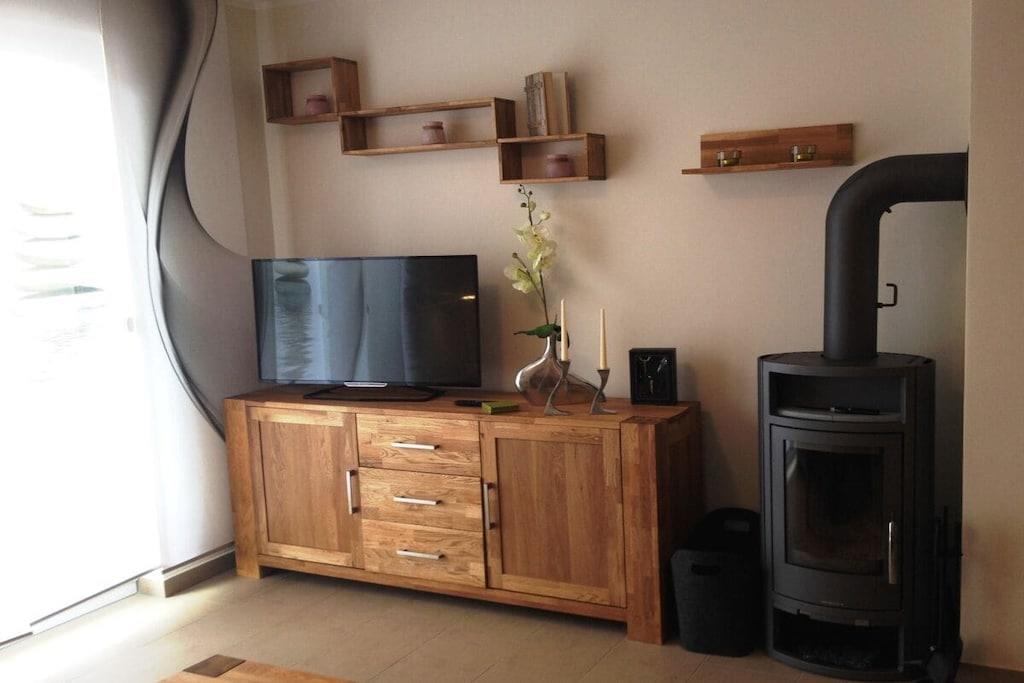 In der 1. Etage: (Wohn-/Schlafzimmer(, , , , , , , , , Kochnische, Toilette, Bibliothek, Schlafcouch 1 Pers., TV, Esstisch, Kaminofen, Kochplatte, Wasserkocher, Toaster, Kaffeemaschine, Backofen, Grill, Mikrowelle, Spülmaschine, Kühlschrank, Tiefkühlschrank, Dusche, Waschbecken, Heizung, Hochstuhl, Föhn, Fliegenfenster), Schlafzimmer(, Doppelbett, TV, Heizung), Badezimmer(, Toilette, Dusche, Waschbecken, Heizung)) , , Abstellraum, Internet, Internet, Erste-Hilfe-Station, Balkon(, Gartenmöbel), Heizung, Bügelbrett, Bügeleisen, Trockenschrank