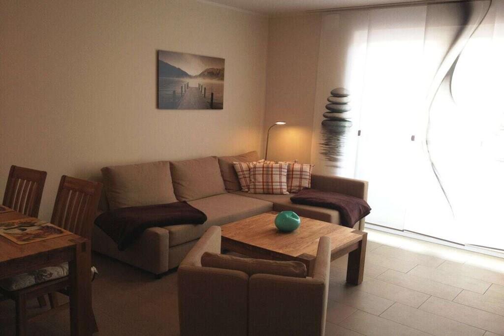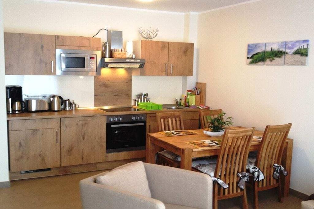 Die neuwertige und exklusive Ferienwohnung wurde im Sommer 2014 im Ortsteil Dierhagen-Strand fertiggestellt und befindet sich im 1. Obergeschoss der Strandvilla am Wiesenweg 4, Wohnung 4 mit einmaliger ruhiger Lage direkt am Ostseestrand von Dierhagen. Dieser verspricht einen 7 km langen, feinsandigen und bis zu 40 m breiten Sandstrand, welcher zum Baden, Spazieren sowie zu sportlichen Aktivitäten in einem der sonnenreichsten Orte Deutschlands einlädt. Nach nur 150 m erreichen Sie direkt den Strandzugang!!! Die helle, ca. 50 m² große Nichtraucherwohnung bietet Platz zum Erholen für bis zu 4 Personen und ist modern und komfortabel eingerichtet. Es erwartet Sie ein Sonnenlicht durchfluteter Wohnraum mit gemütlicher Sitzecke (als Schlafsofa nutzbar) mit LED-TV, einen modernen Kaminofen (für romantisches Flair in der kalten Jahreszeit), einem einladenden Essbereich mit integrierter und hochwertiger Einbauküche, (ausgestattet mit Cerankochfeld, Backofen, Mikrowelle, Geschirrspüler, Kühlschrank mit Gefrierfach, Kaffeemaschine, Wasserkocher, Toaster, Espressokocher, Milchaufschäumer). Das Schlafzimmer ist mit einem bequemen Doppelbett (180 x 200), nebst 3-türigen Kleiderschrank und LED-TV ausgestattet. Das Bad verfügt über eine großzügige ebenerdige Dusche, einem Waschtisch, WC, Fön und Handtuchheizkörper. Im Außenbereich steht ein möblierter Balkon mit Deichblick zur Verfügung, welcher Sie in den Abendstunden zum Bestaunen traumhafter Sonnenuntergänge empfängt. Die Fußbodenheizung verspricht auch im Winter wohlige Wärme. Zur Ferienwohnung gehört direkt vor der Strandvilla ein kostenfreier Pkw Stellplatz (H4W4) und ein eigener abschließbarer persönlicher Unterstellplatz (H4W4), für mitgebrachte Fahrräder/E-Bikes inkl. Lademöglichkeit, Luftmatratzen, Sportartikel usw. Außerdem steht ein Bollerwagen und ein Kinderhochstuhl kostenlos für Sie bereit. Falls Sie einen Strandkorb oder Fahrräder mieten möchten, die Ausleihstation befindet sich im nahegelegenen Ostseehotel Dierhagen (50m). Habe ich Ihre Urlaubslust geweckt?