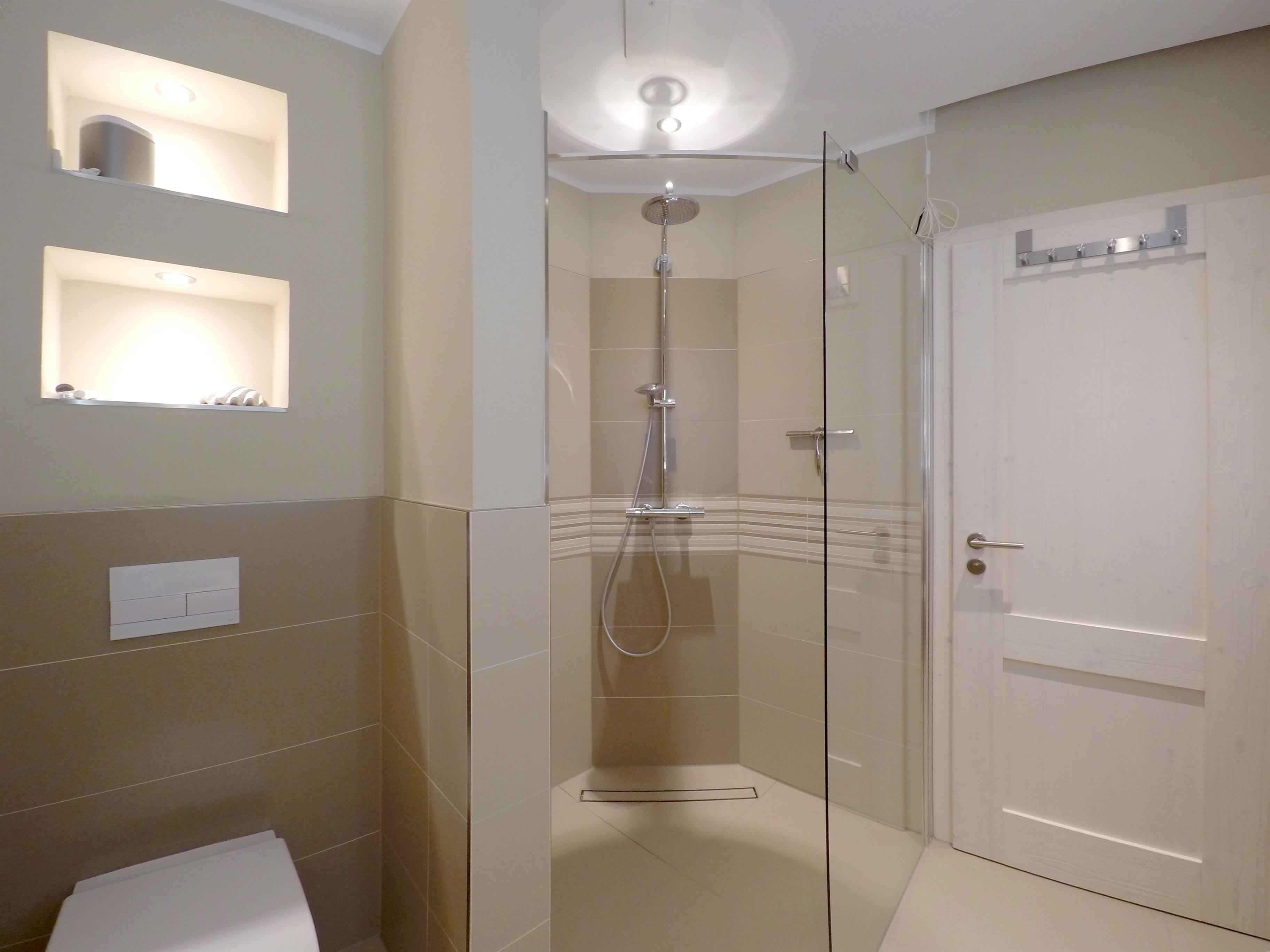 - ein Badezimmer mit großer bodengleicher Eckdusche, Fön, beleuchteter Kosmetikspiegel,