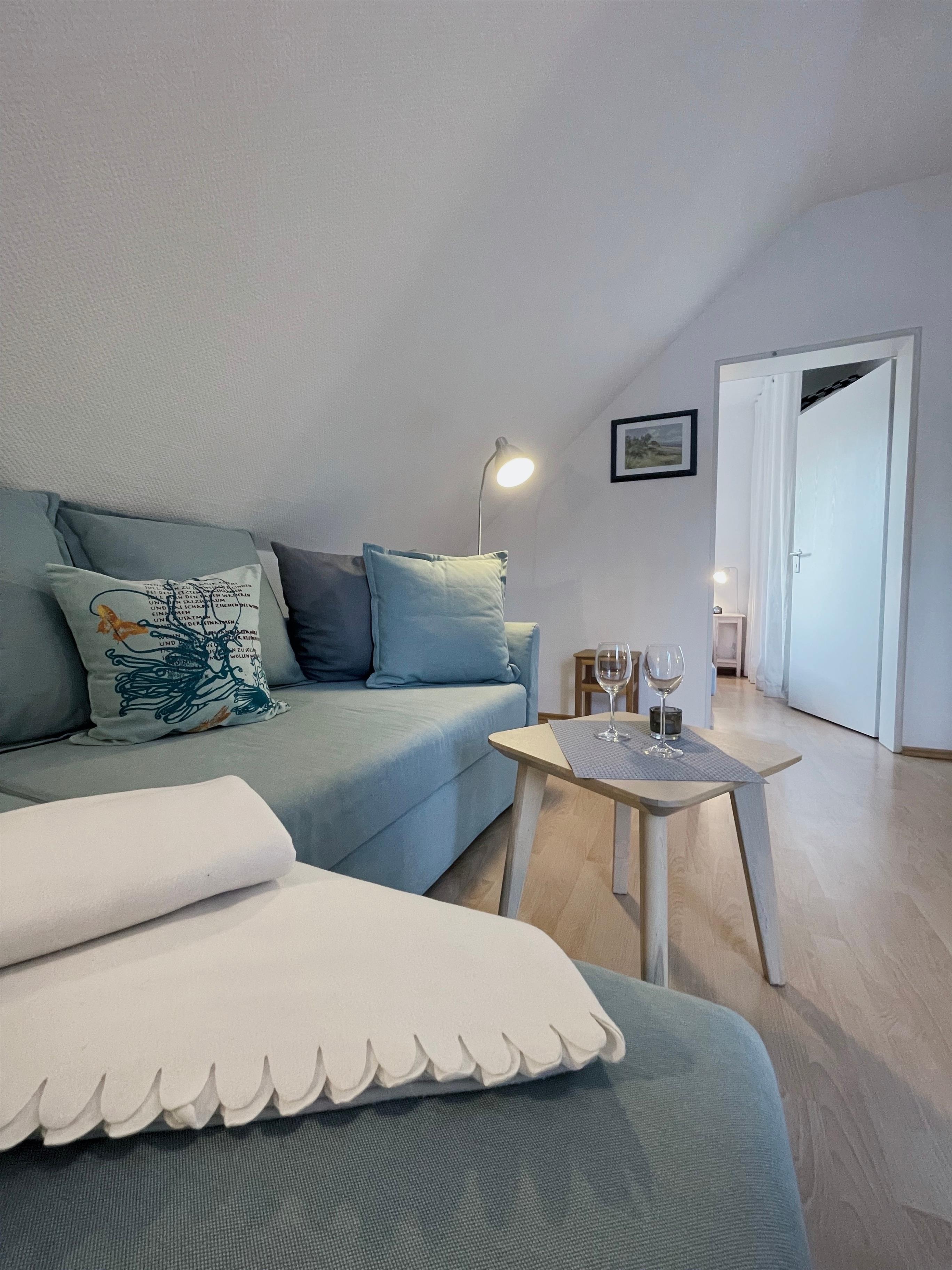 - ein gemütliches Wohnzimmer mit Flat-SAT-TV und einer ausziehbaren Schlafcouch für 2 Personen