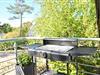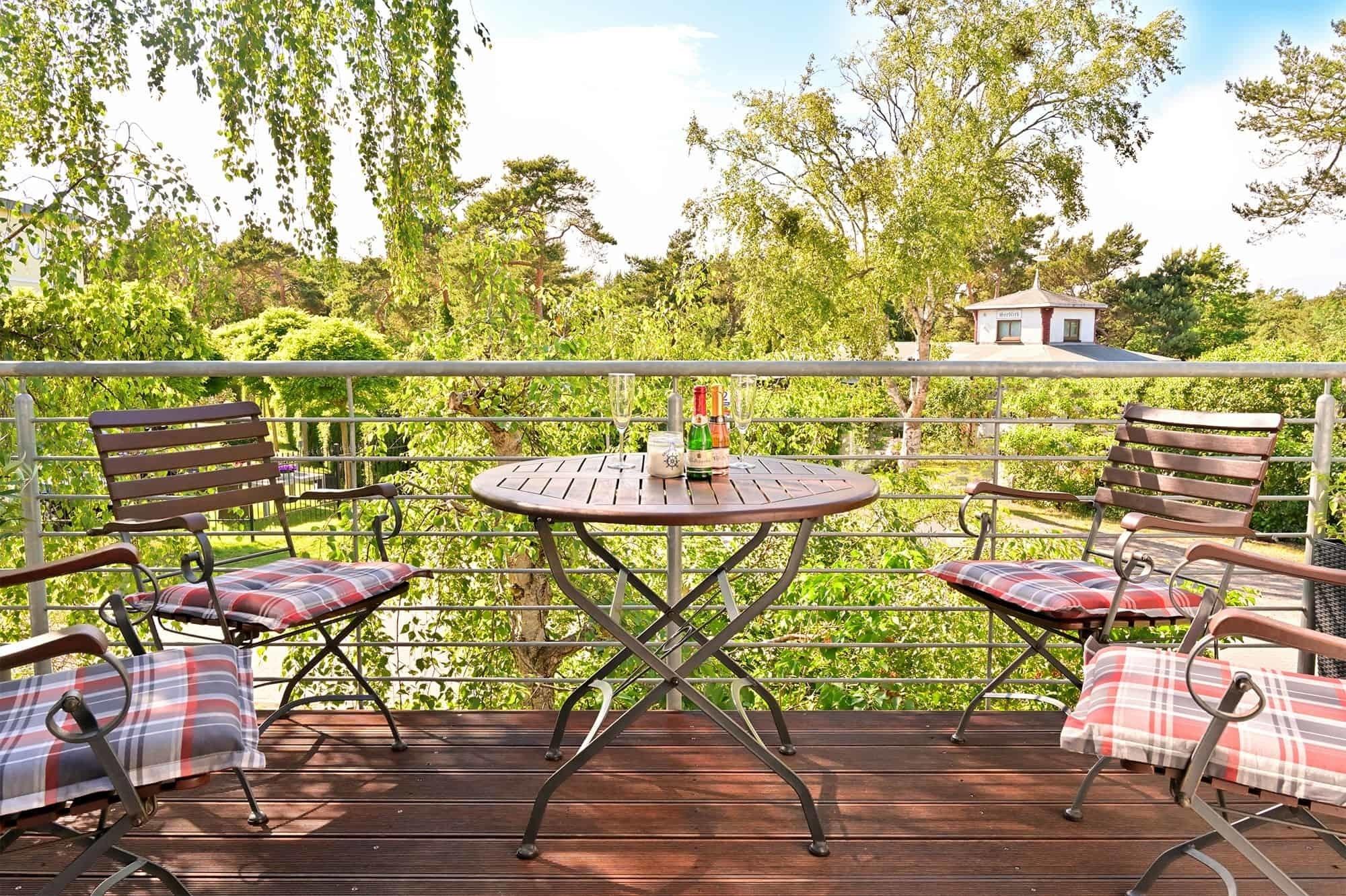 ·Möbelierter sonniger Balkon mit Ausblick auf den Küstenwald