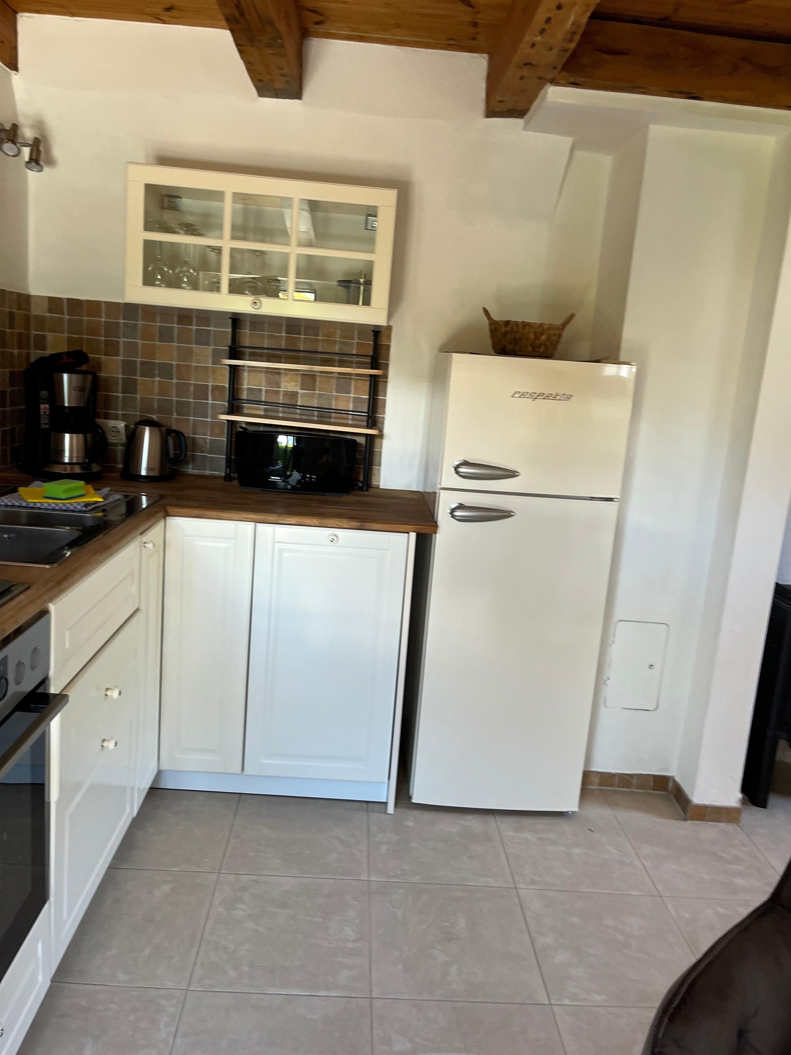 Für kalte Abende ist ein Kaminofen mit Holz vorhanden.