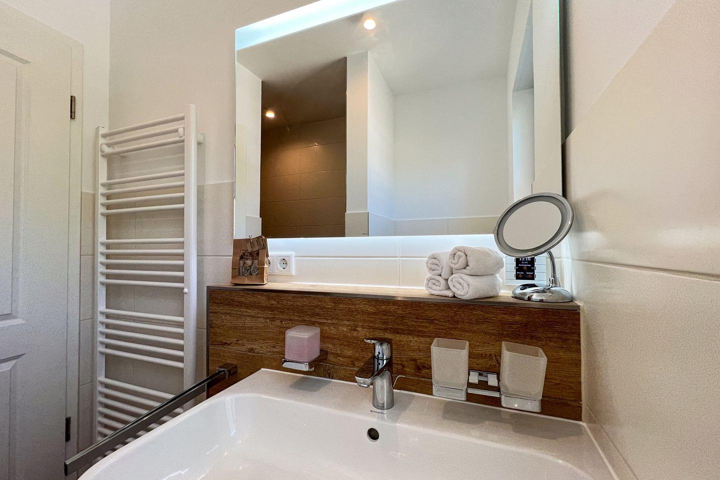 Das Interieur der Wohnung ist ein Paradebeispiel für modernen Komfort und Eleganz. Eine Designerküche, die geschickt in den Wohnbereich integriert ist, eine multifunktionale Eckcouch und ein einladender Essbereich. Genießen Sie Filmabende mit dem großen Smart-TV, der von jedem Winkel des Raums aus sichtbar ist. Der Kamin und die Infrarotsauna sorgen für zusätzliche Gemütlichkeit und Entspannung. Das Schlafzimmer, mit seinem hochwertigen Doppelbett und geräumigen Schrank, führt in ein modernes Badezimmer mit einer großzügigen, ebenerdigen Dusche. Im Eingangsbereich erwartet Sie eine praktische Garderobe mit großem Spiegel. Ihr Komfort wird durch einen eigenen PKW-Stellplatz direkt am Haus mit der Nr. 3 abgerundet.