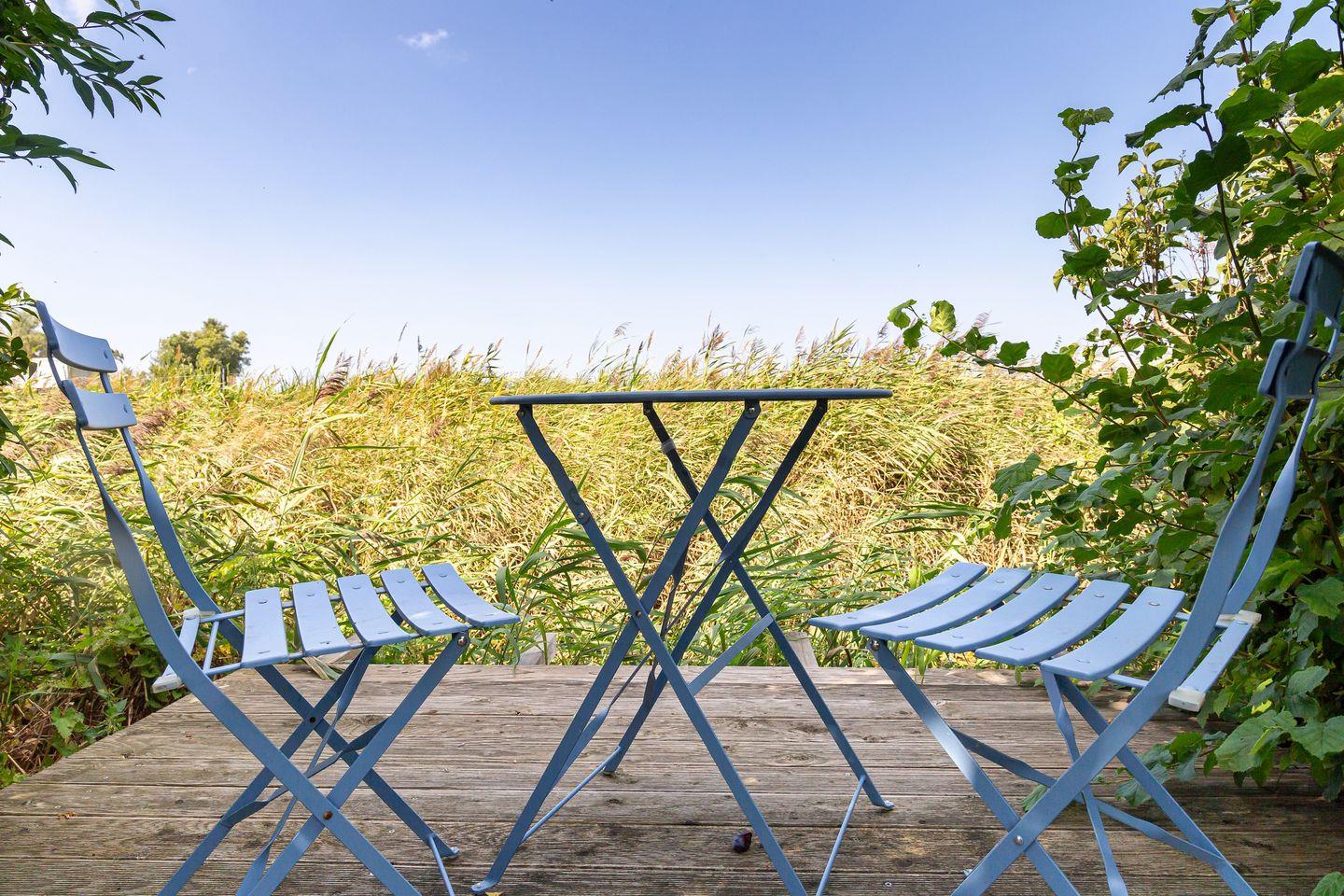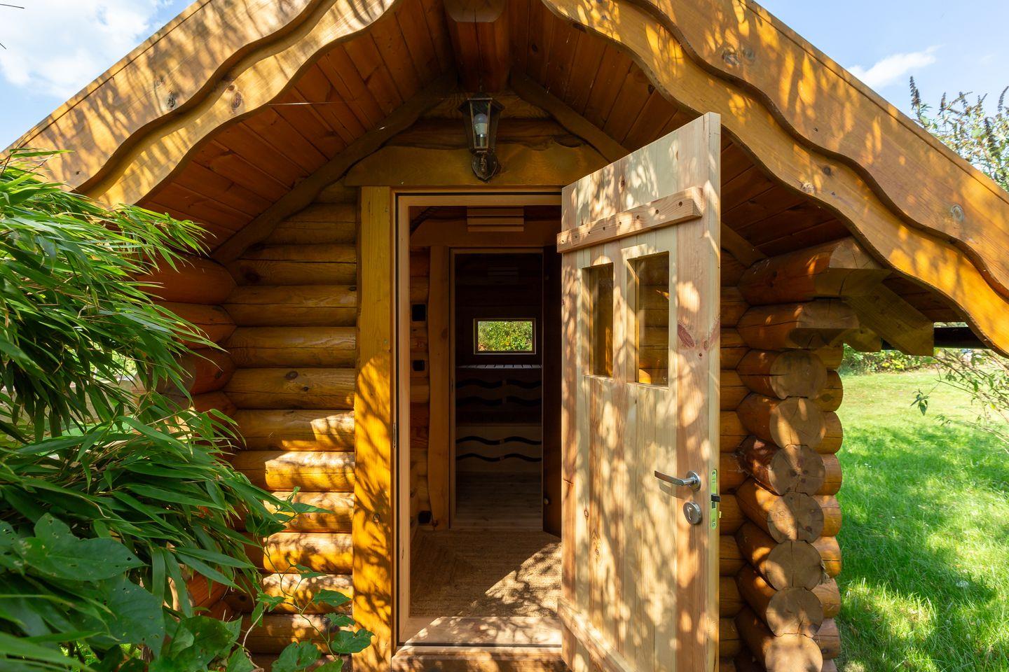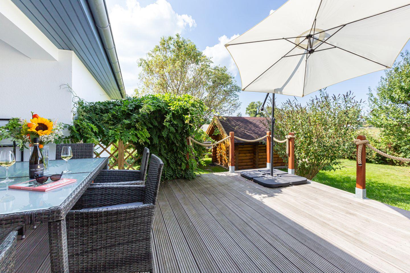 Weitere Highlights erwarten dich im Außenbereich, wie beispielsweise die großzügige Terrasse, auf der du den weiten Blick ins Grüne genießt. Das Saunahäuschen* lädt nach einem ereignisreichen Urlaubstag zum Entspannen ein und der große Garten bietet viel Platz, um einfach mal die Seele baumeln zu lassen. Eine weitere Sitzecke befindet sich an dem kleinen Kanal, der am Haus vorbeiführt - ein wunderschönes Plätzchen für den ersten Kaffee des Tages.