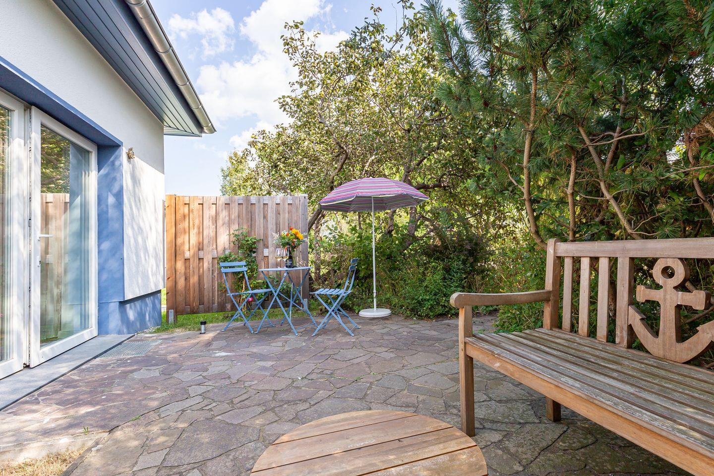 Besonders schön ist die Terrasse mit ihrem Blick ins Grüne. Hier kannst du die Ruhe genießen, die Natur auf dich wirken lassen und einfach mal abschalten. Ob du dich nach einem erlebnisreichen Tag am Meer zurückziehst oder einen ruhigen Nachmittag in der Sonne verbringst – Dat lütt Eenhoorn ist der perfekte Ort, um deinen Urlaub in vollen Zügen zu genießen.