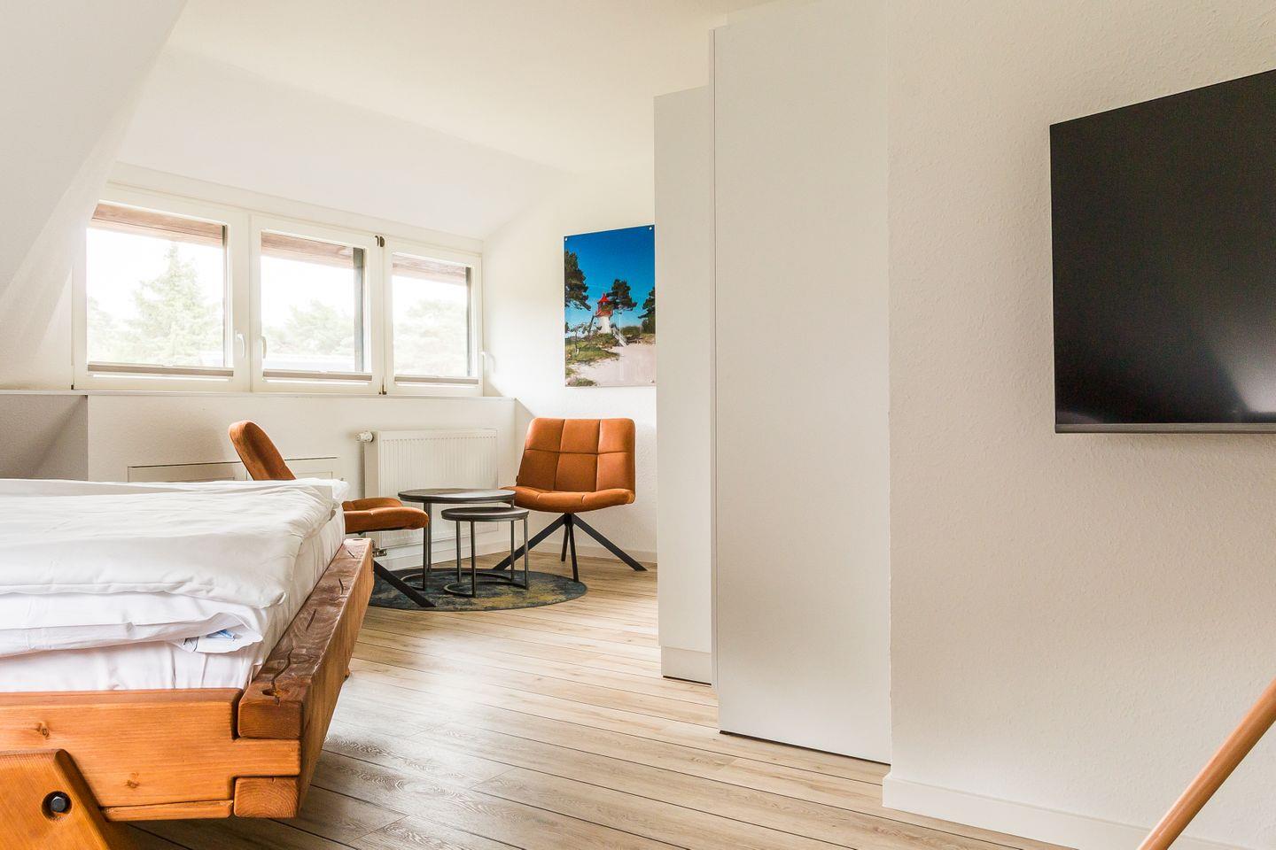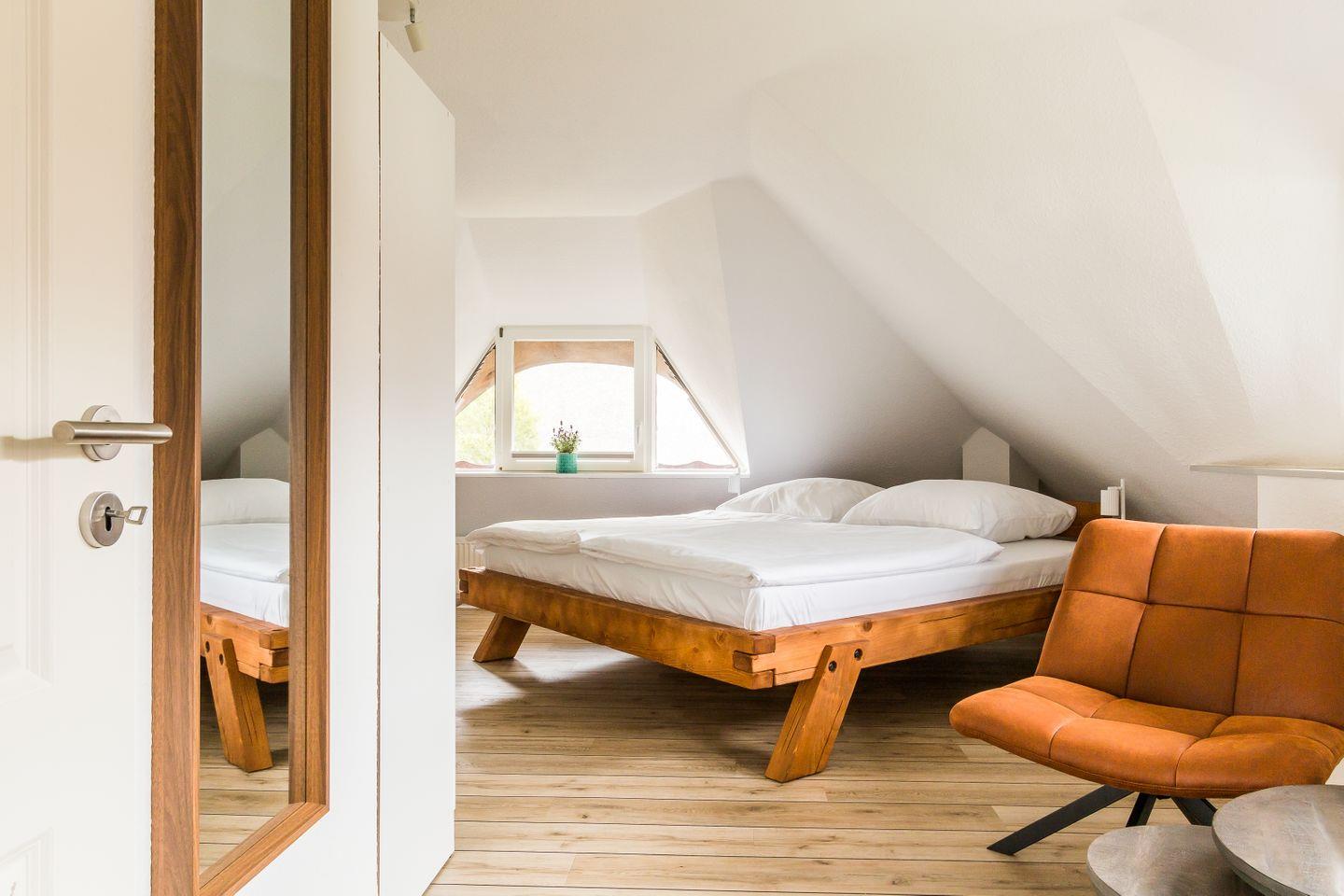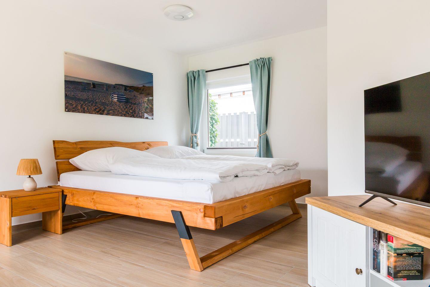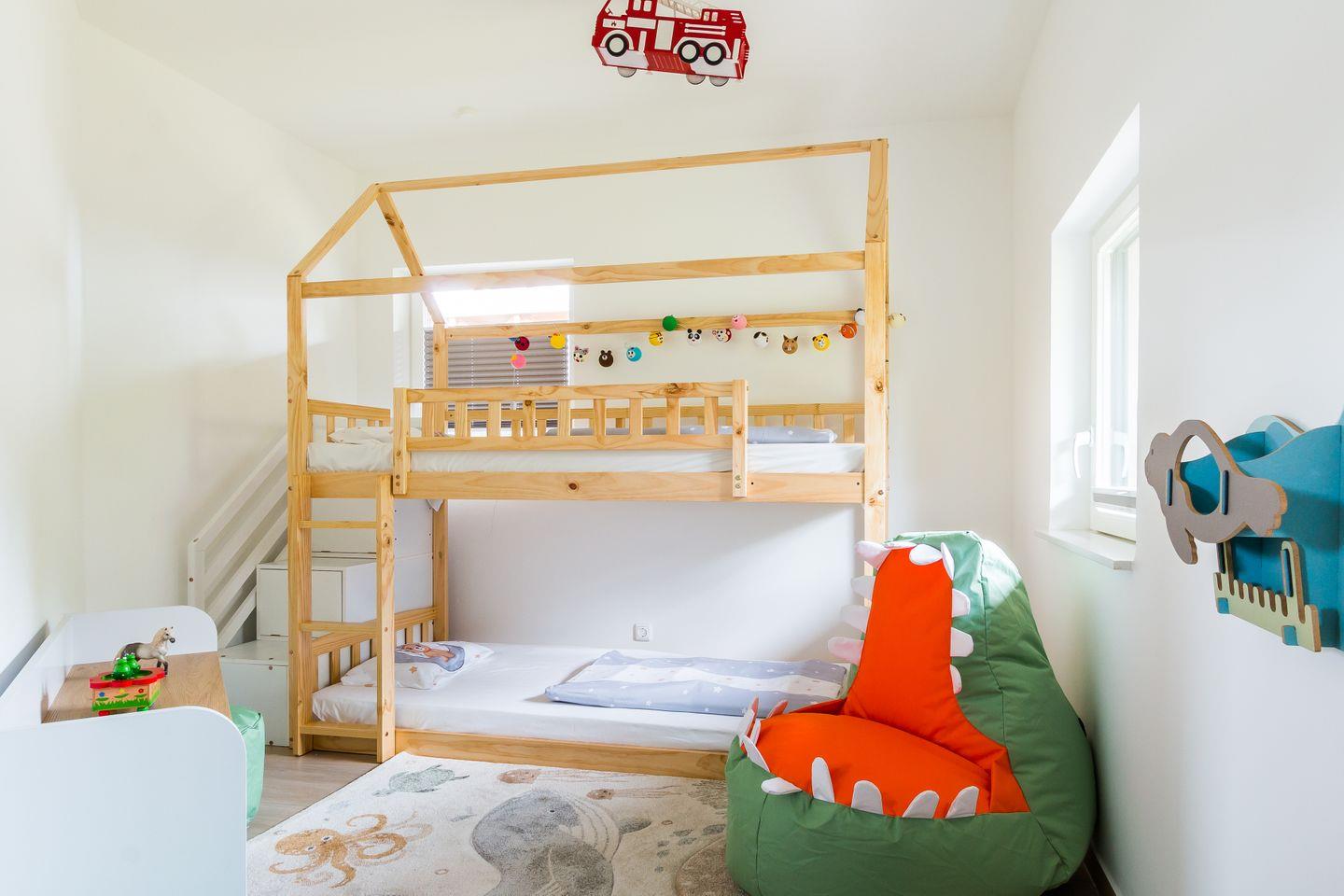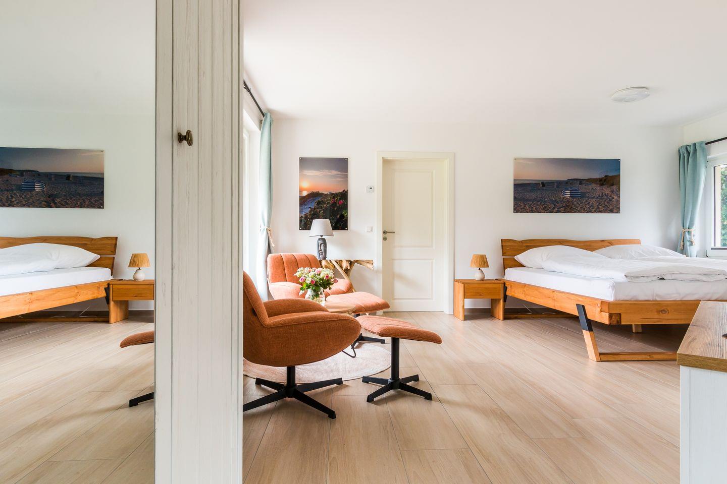 Dieses tolle und ganz frisch sanierte Ferienhaus bietet endlich einmal genug Platz für die Großfamilie oder gleich zwei befreundete Familien. Zwei liebevoll eingerichtete Kinderzimmer machen’s möglich: eins mit spannendem Doppelstockbett, das andere mit zwei Kinderbetten plus einem weiteren Bett für eine erwachsene Person. Und die Großen? Die schlafen in zwei stilvollen Schlafzimmern mit Doppelbett, gemütlicher Sitzecke, Stauraum und eigenem TV. Jeder der vier Räume ist ein heimeliger Rückzugsort mit Wohlfühlfaktor.