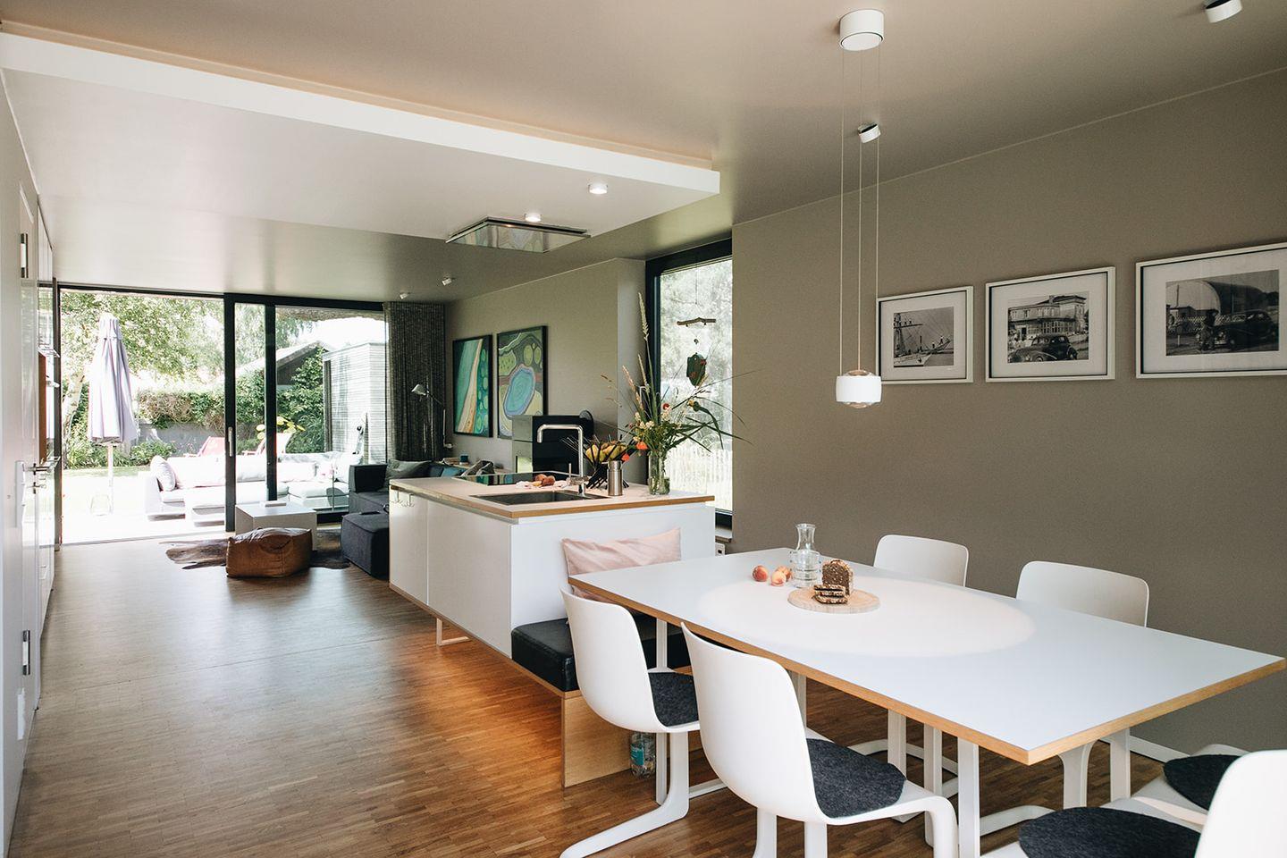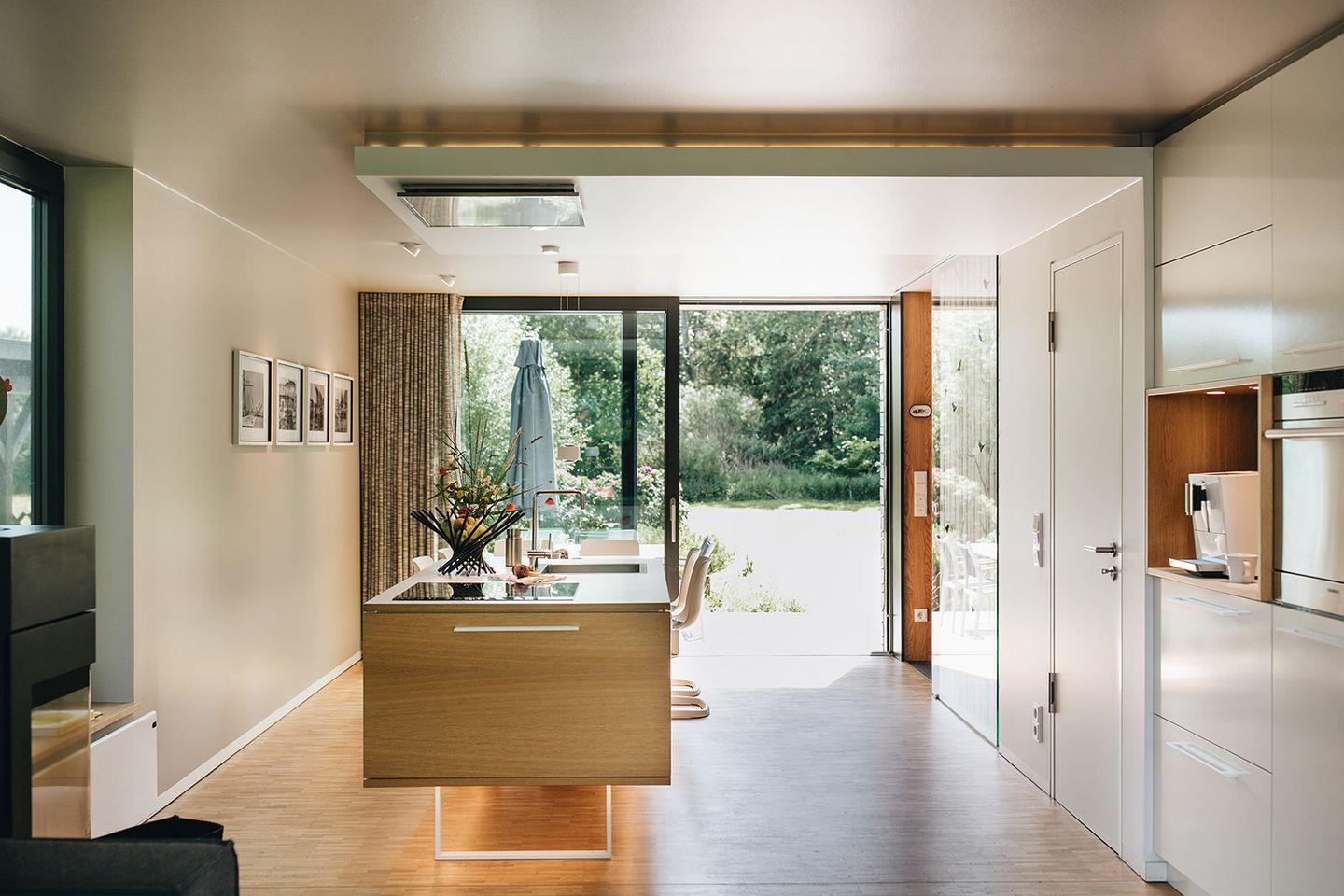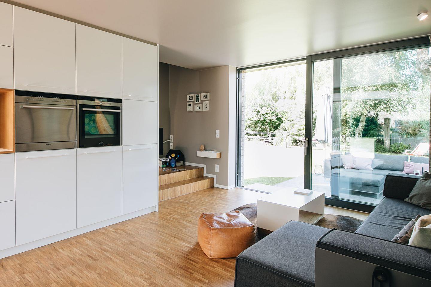 Im Erdgeschoss bildet die offene Wohnküche das Zentrum des Hauses. Modern und hochwertig ausgestattet, lädt sie zum gemeinsamen Kochen und Verweilen ein. Der großzügige Essbereich schafft Raum für lange Gespräche, während der angrenzende Wohnbereich mit Kaminofen an kühleren Tagen für wohlige Wärme sorgt.