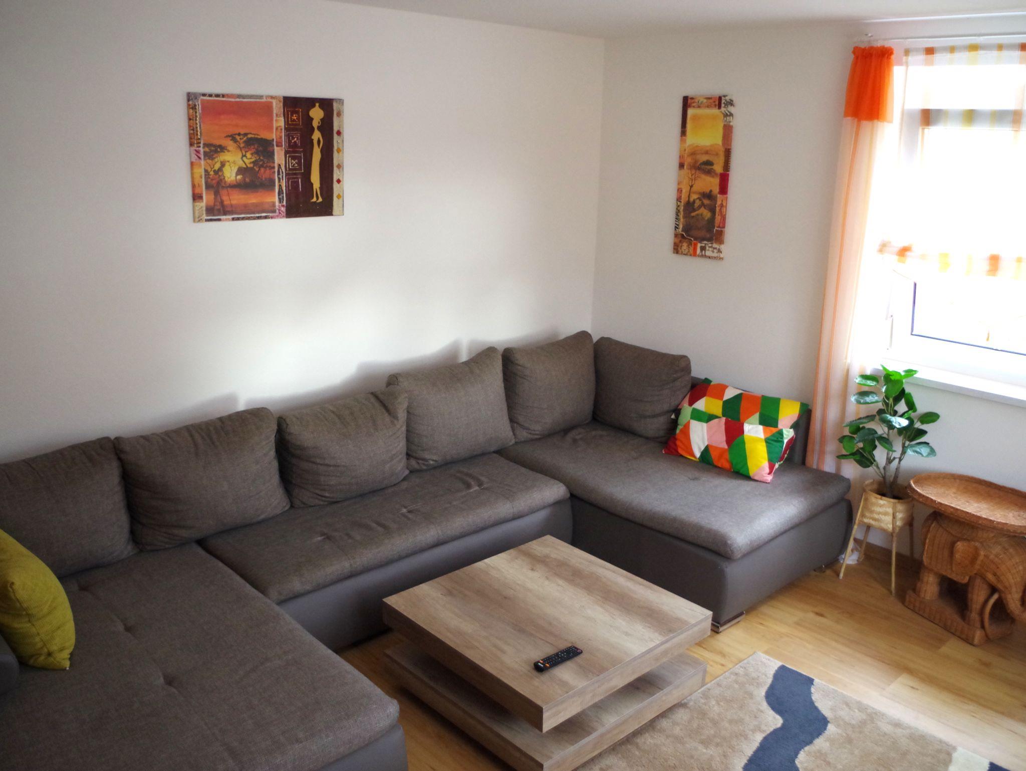 entsprechendes Geschirr. Als Essplatz dient eine gemütliche Eckbank-Sitzgruppe, die Platz für 4 Personen bietet. Spül- und Reinigungsmittel und -utensilien sind ausreichend vorhanden. Das Wohnzimmer überzeugt mit einem sehr großen Sofa, auf dem bei Bedarf auch geschlafen werden kann. Kontaktieren Sie uns dazu bitte bei Bedarf. Im Schlafzimmer befindet sich ein Doppelbett, sowie eine weitere Couch, die ebenfalls ggf. zum Schlafen genutzt werden könnte. Der Sanitärbereich besteht aus einem neuen, modernen Bad mit bodengleicher Dusche, Badewanne, sowie einem Waschtisch mit Spiegelschrank. Ein Fön ist vorhanden. In einem separaten Raum finden Sie das WC mit Handwaschtisch, dort stehen Staubsauger, Besen und weitere Putzmittel und -utensilien bereit. Ein Garderobenspiegel sowie eine Wandgarderobe und ein Schuhregal befinden sich im Flur. Ihren PKW können Sie kostenlos auf einem befestigten Stellplatz im Hof abstellen. Fahrräder können nach Absprache und gegen Gebühr (2 Euro pro Rad und Nacht) in unserer Garage über Nacht eingestellt werden.