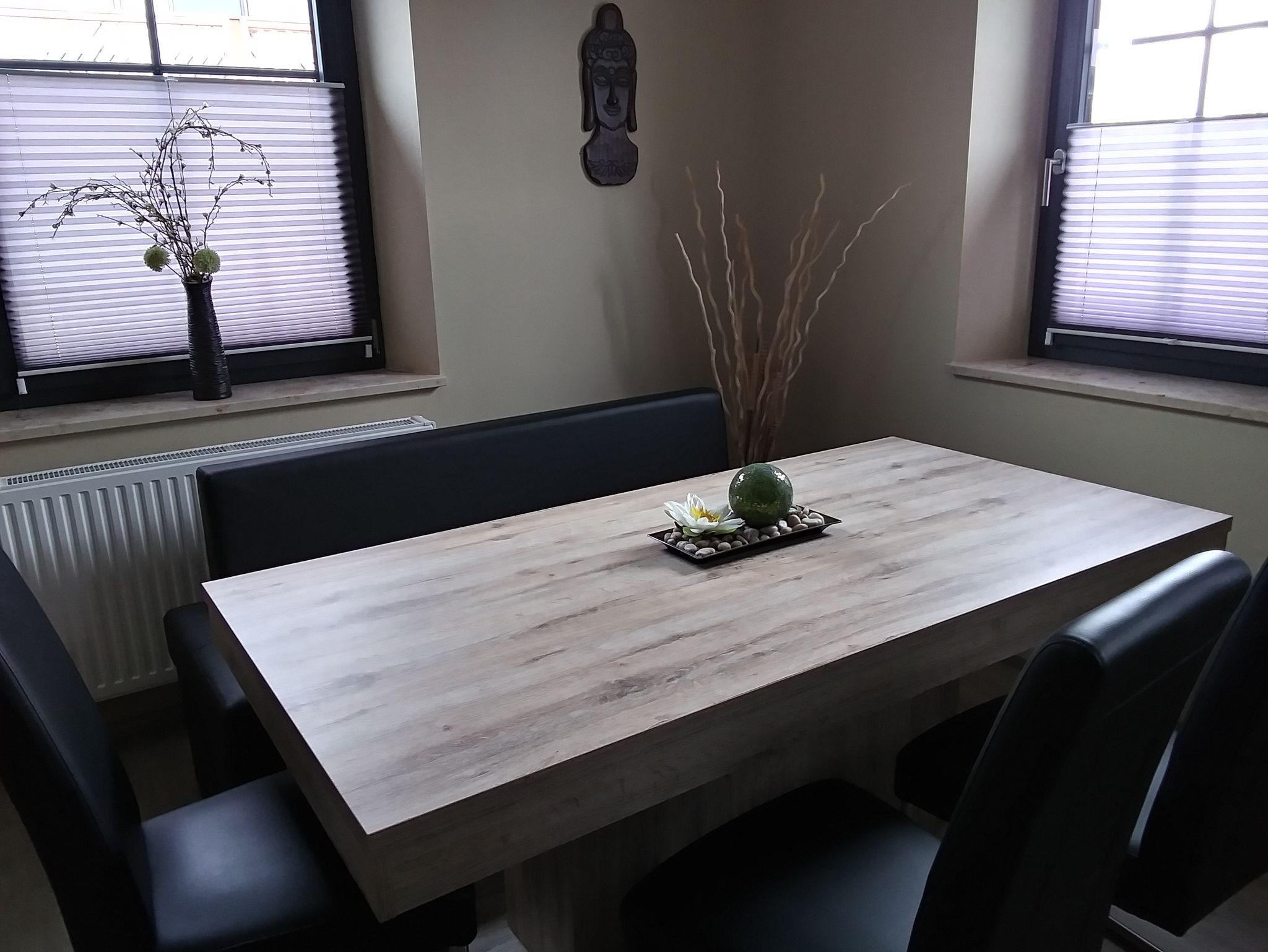 Der Wohnraum beinhaltet einen großen Esstisch mit einer Bank und drei Stühlen, eine kleine Wohnecke mit ausziehbarer Couch und TV, eine Entspannungsecke mit Relaxliege und natürlich eine Schlafecke mit großem Schlafzimmerschrank, zwei Nachtkästchen und einem Doppelbett mit allergiefreien,feuchtigkeitsregulierenden Alpakabetten (natürlich aus Wolle von unseren Alpakas :-) Wechselbettwäsche ist vorhanden.