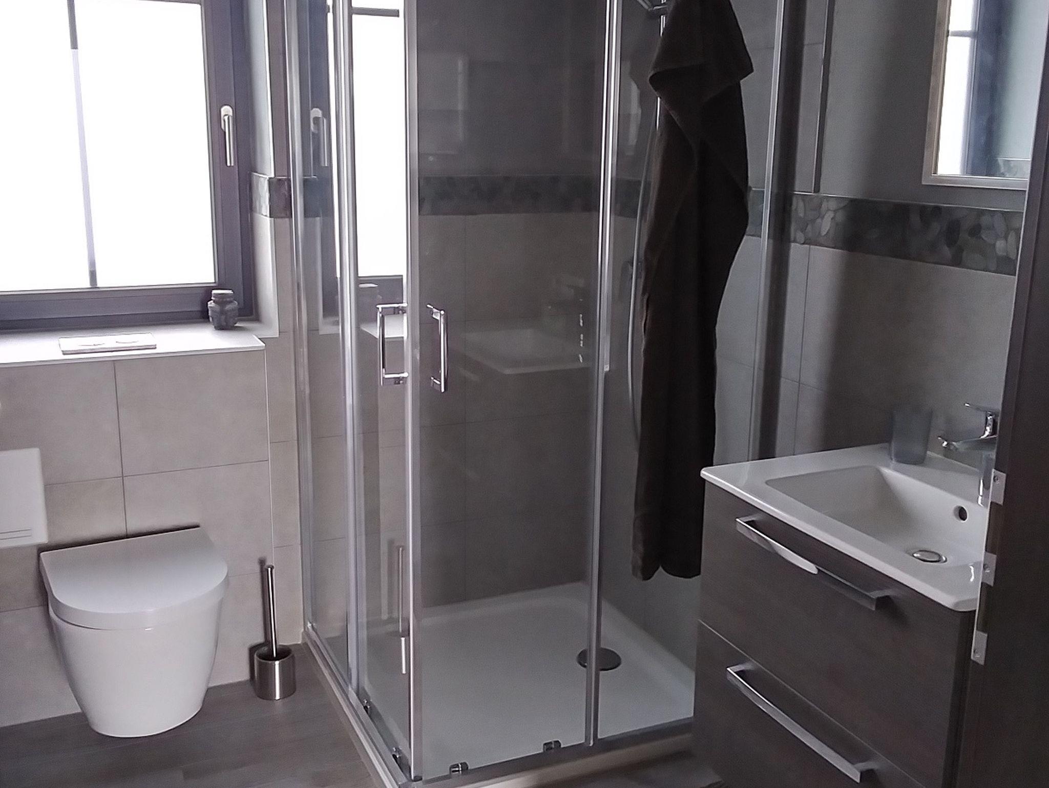 Das kleine Badezimmer mit Fenster, verfügt über eine Dusche, ein kleines Waschbecken, Toilette und einen Spiegel. Handtücher sind vorhanden. Toilettenpapier, Flüssigseife, Papiertücher und Desinfektionsmittel stehen Ihnen zur Verfügung.
