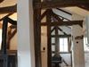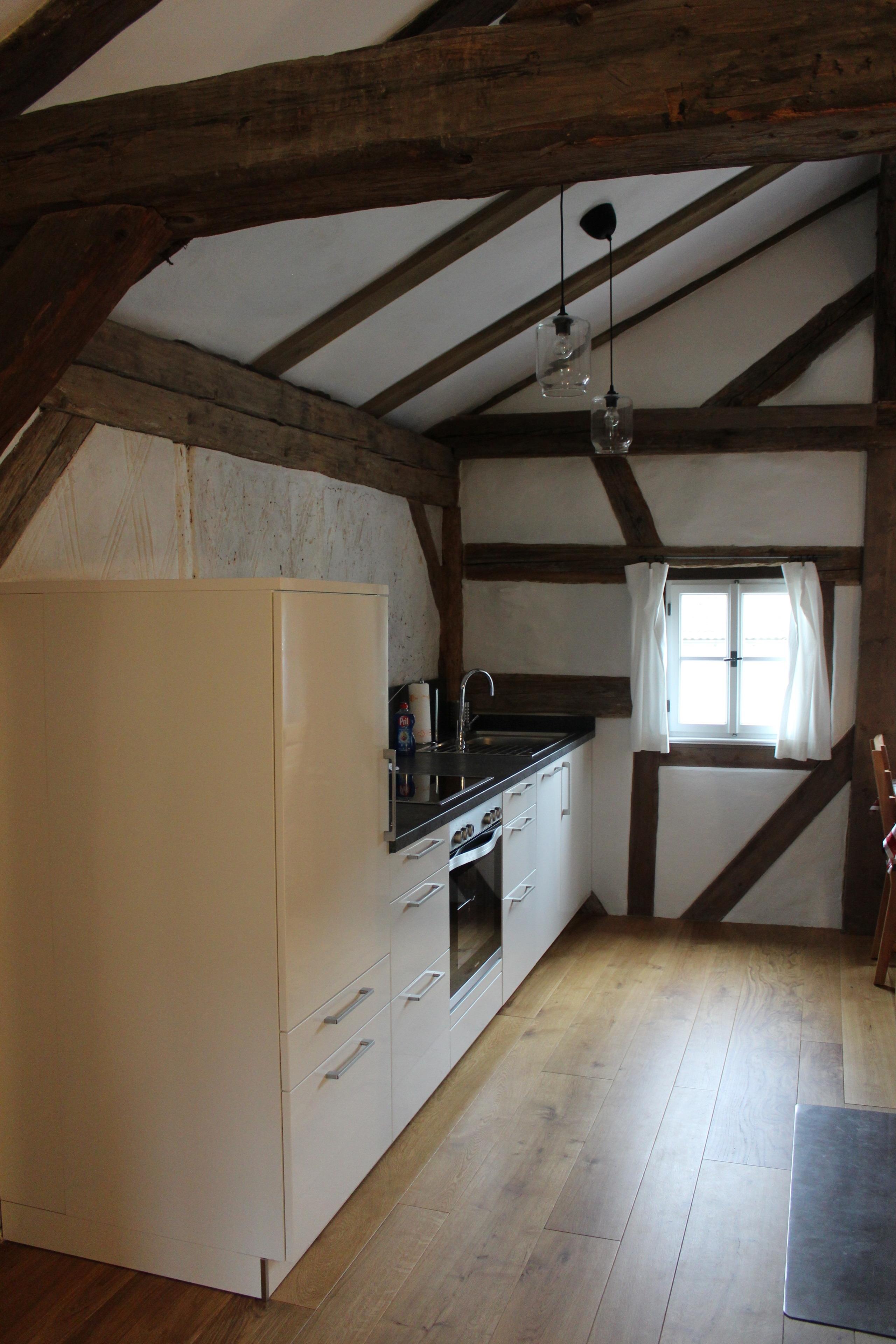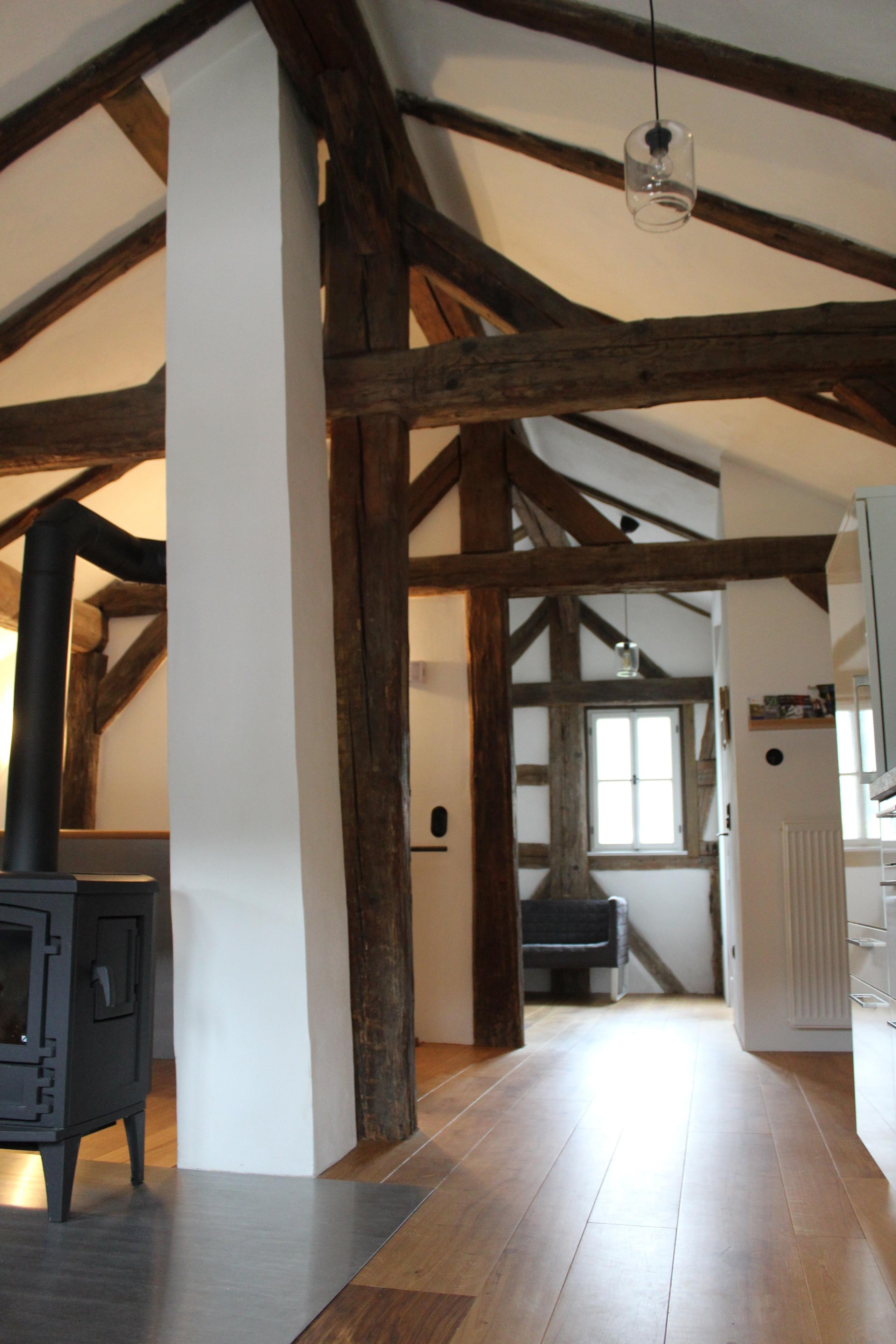 Nach der Eingangstüre zur Wohnung im Obergeschoss, ist Platz für Ihre Garderobe und die Schuhe vorgesehen. Unmittelbar gelangen Sie über die Holztreppe direkt in das Obergeschoss. Hier befindet sich im offen gehaltenen Bereich sowohl die Küche, als auch das Wohn- und Esszimmer. Der Eichendielenboden bildet dort mit den historischen Balken eine perfekte Harmonie.