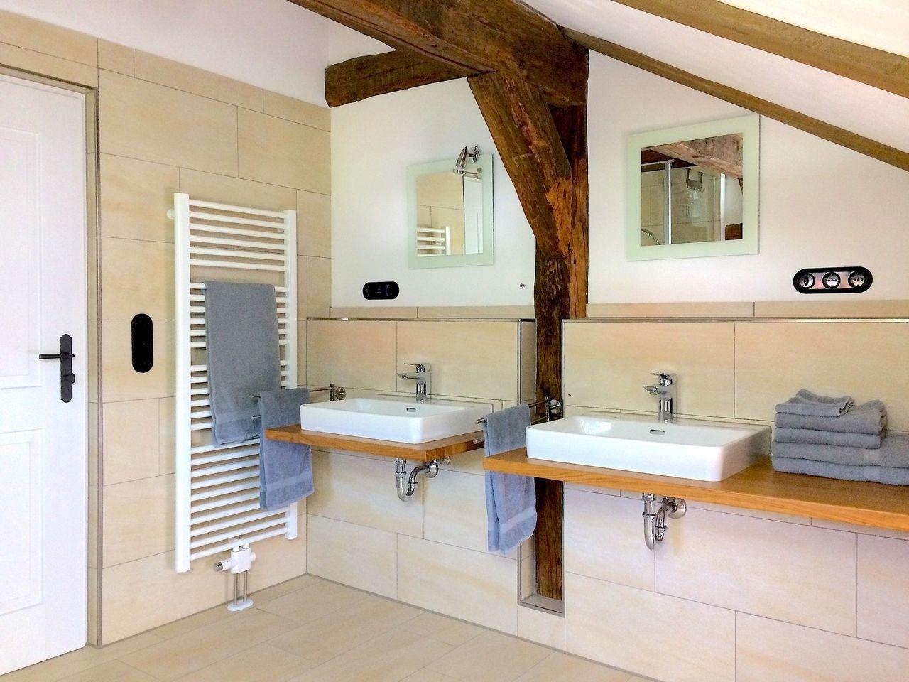 Im Bad mit zwei Waschbecken und einer Dusche befindet sich auch das WC. Für wohlige Wärme sorgen die Fußbodenheizung und ein Handtuchwärmer. Fön, Glätteisen, Toilettenartikel, Dusch- und Handtücher stehen selbstverständlich zur Verfügung.
