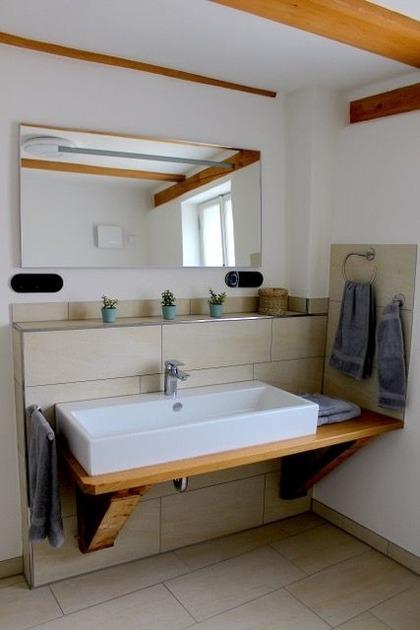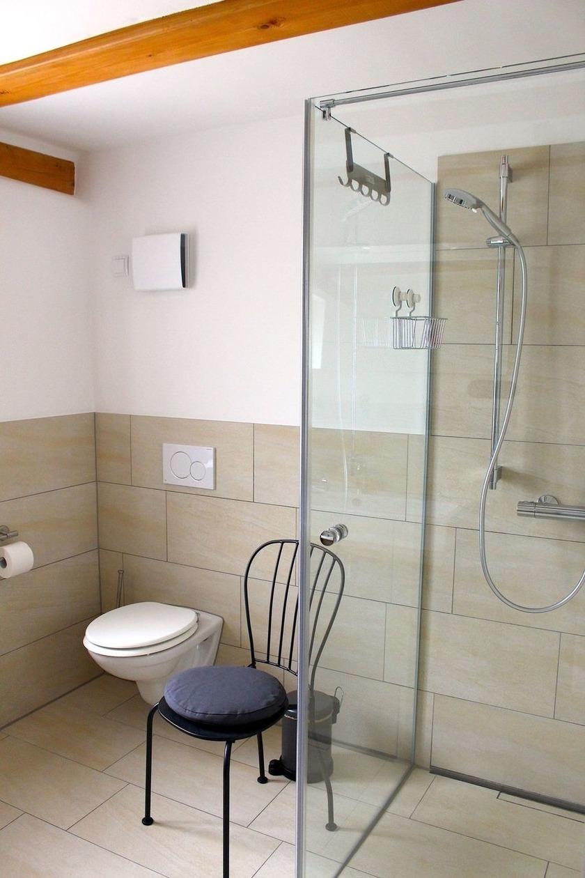 Im Bad mit seinen breiten Waschbecken und ebener Dusche befindet sich auch das WC. Für angenehme Wärme sorgen die Fußbodenheizung und ein Handtuchwärmer. Fön, Glätteisen, Toilettenartikel, Dusch- und Handtücher werden selbstverständlich zur Verfügung gestellt.