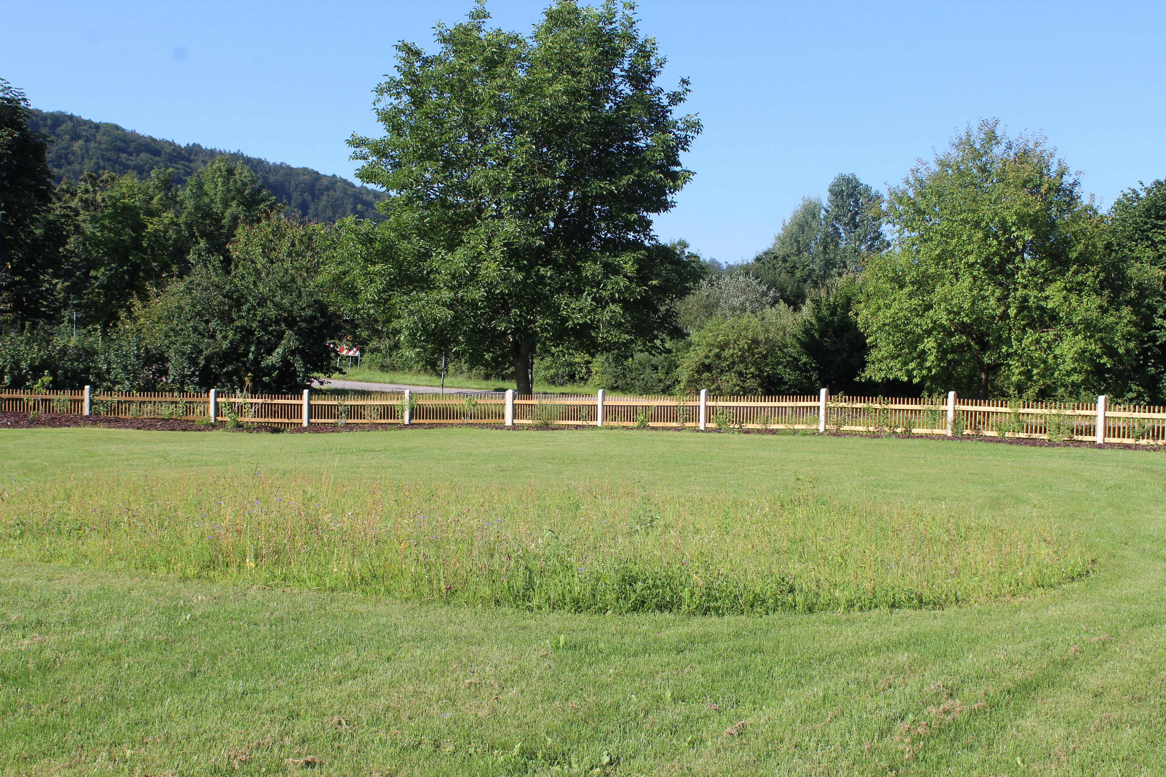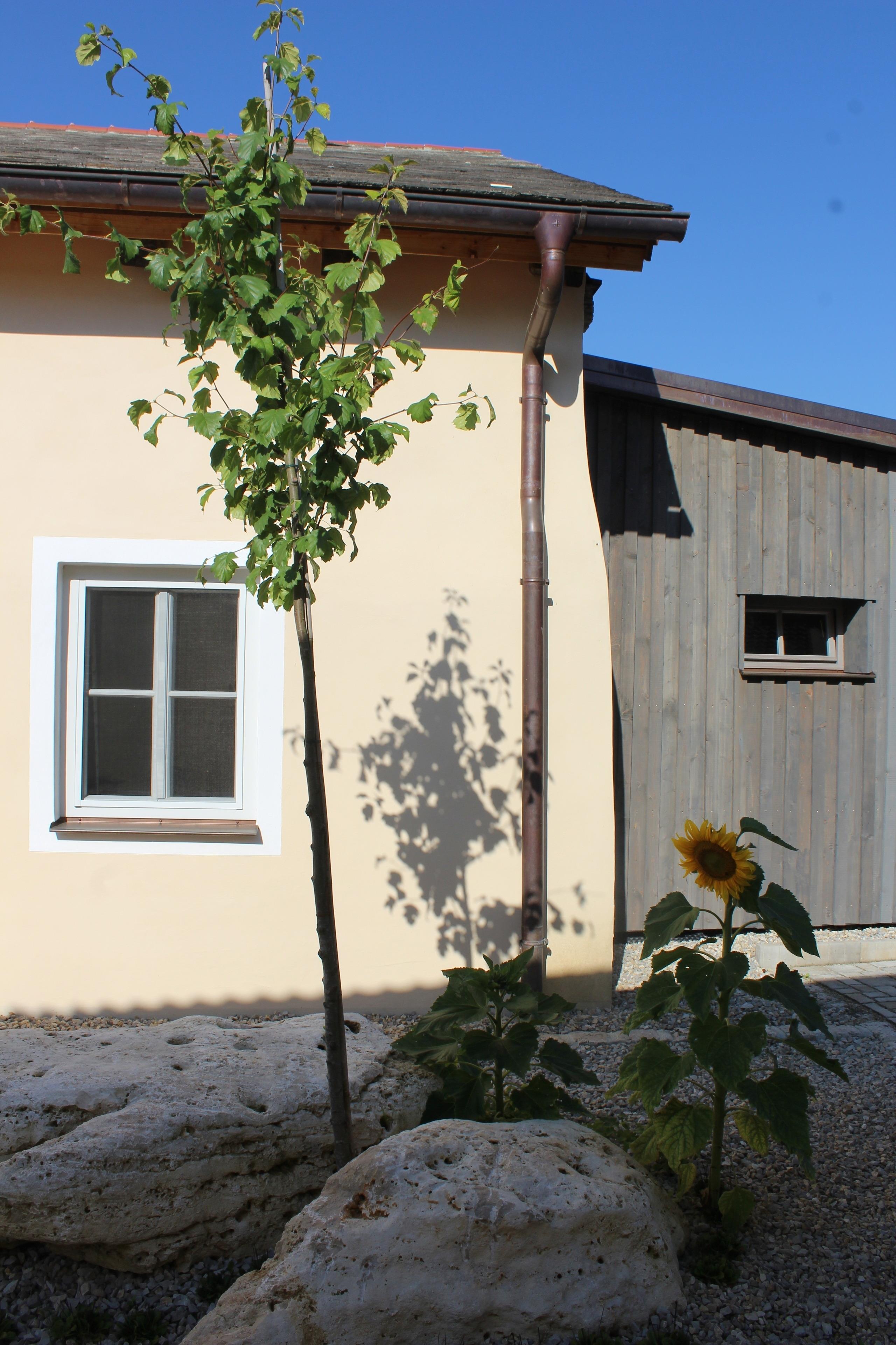 Die Außenanlagen rund um das Haus sind fertiggestellt, der Rasen und die Blumenwiese wachsen und gedeihen.