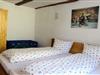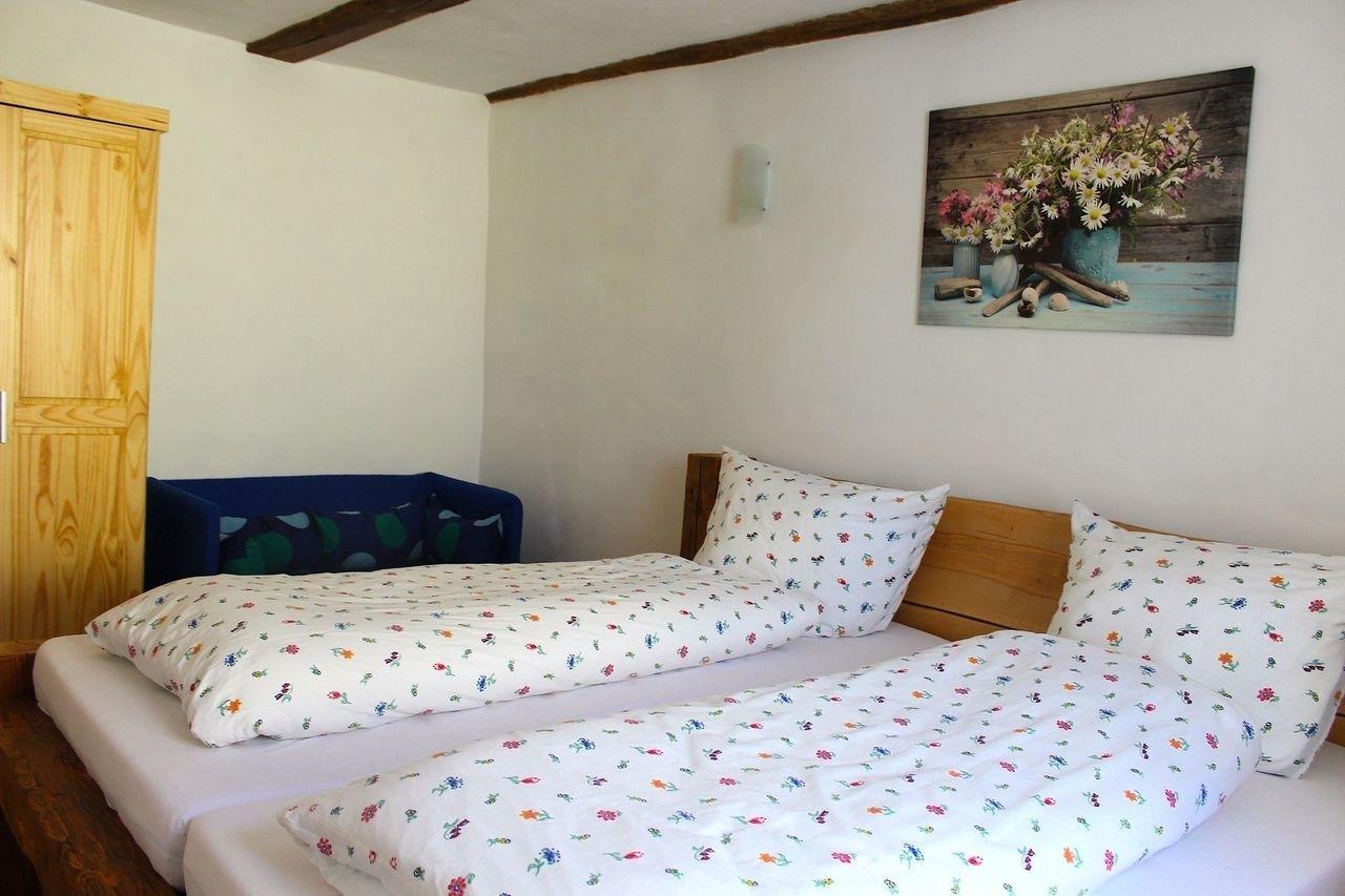 Im Schlafzimmer ruhen Sie in dem 200 cm x 200 cm großen Bett mit zwei Matratzen, das vom Bauherrn aus alten, mit einem Beil bearbeiteten Balken selbst gebaut/geschreinert wurde.