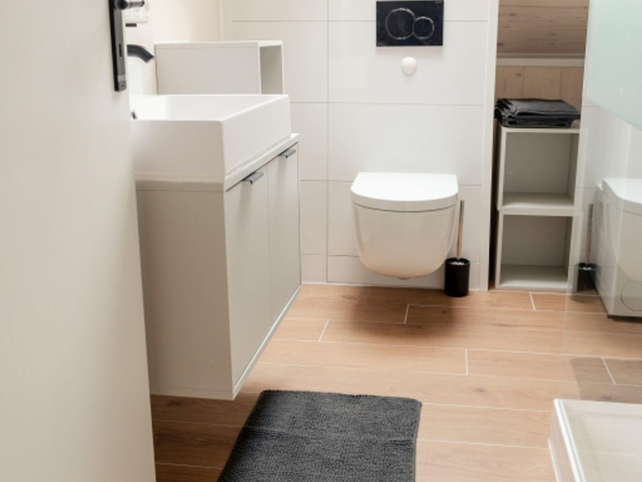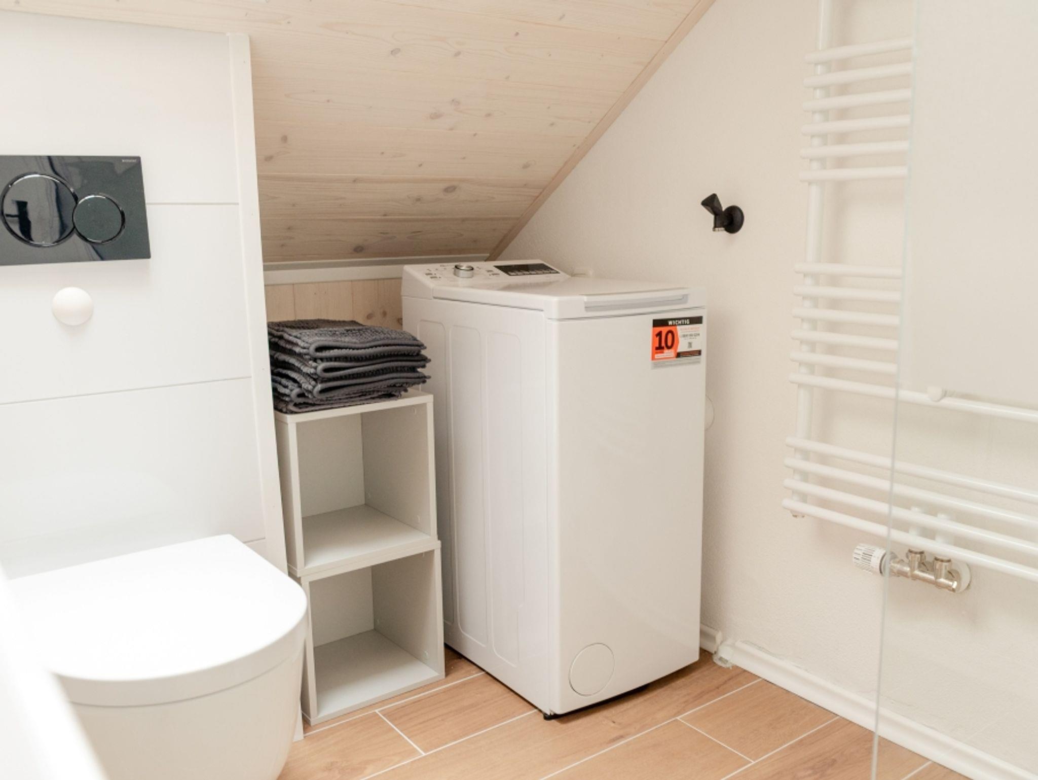Das Bad ist mit Dusche, Waschmaschine und allen notwendigen Annehmlichkeiten ausgestattet.