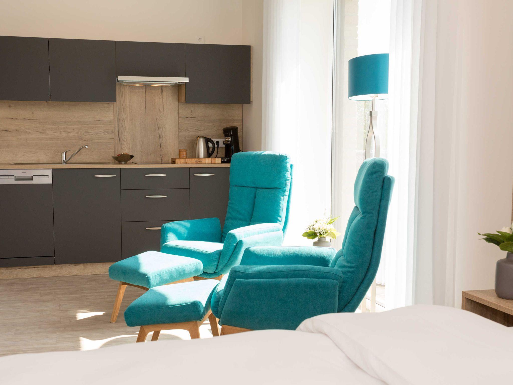 Hochwertig ausgestattetes Apartment. Moderne Einbauküche mit Ceranfeld, Mikrowelle, Toaster, Kaffee-Padmaschine, Wasserkocher, Geschirr, Gläser usw.. Zwei bequeme Sessel mit jeweils einem Fußhocker laden zum verweilen ein. In unseren Box-Springbetten werden Sie himmlisch schlafen.
