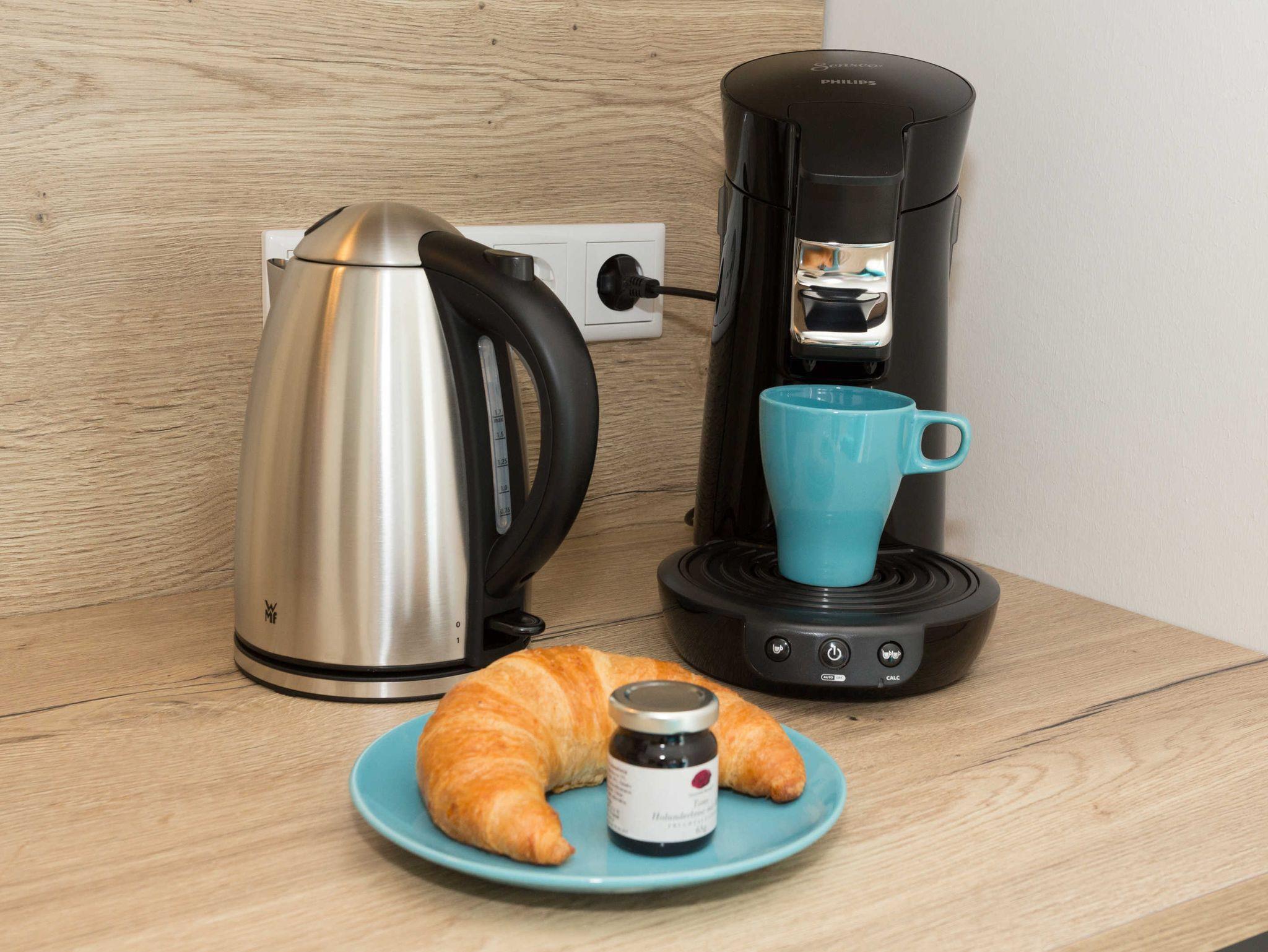 Hochwertig ausgestattetes Apartment. Moderne Einbauküche mit Ceranfeld, Mikrowelle, Toaster, Kaffee-Padmaschine, Wasserkocher, Geschirr, Gläser usw.. Zwei bequeme Sessel mit jeweils einem Fußhocker laden zum verweilen ein. In unseren Box-Springbetten werden Sie himmlisch schlafen.