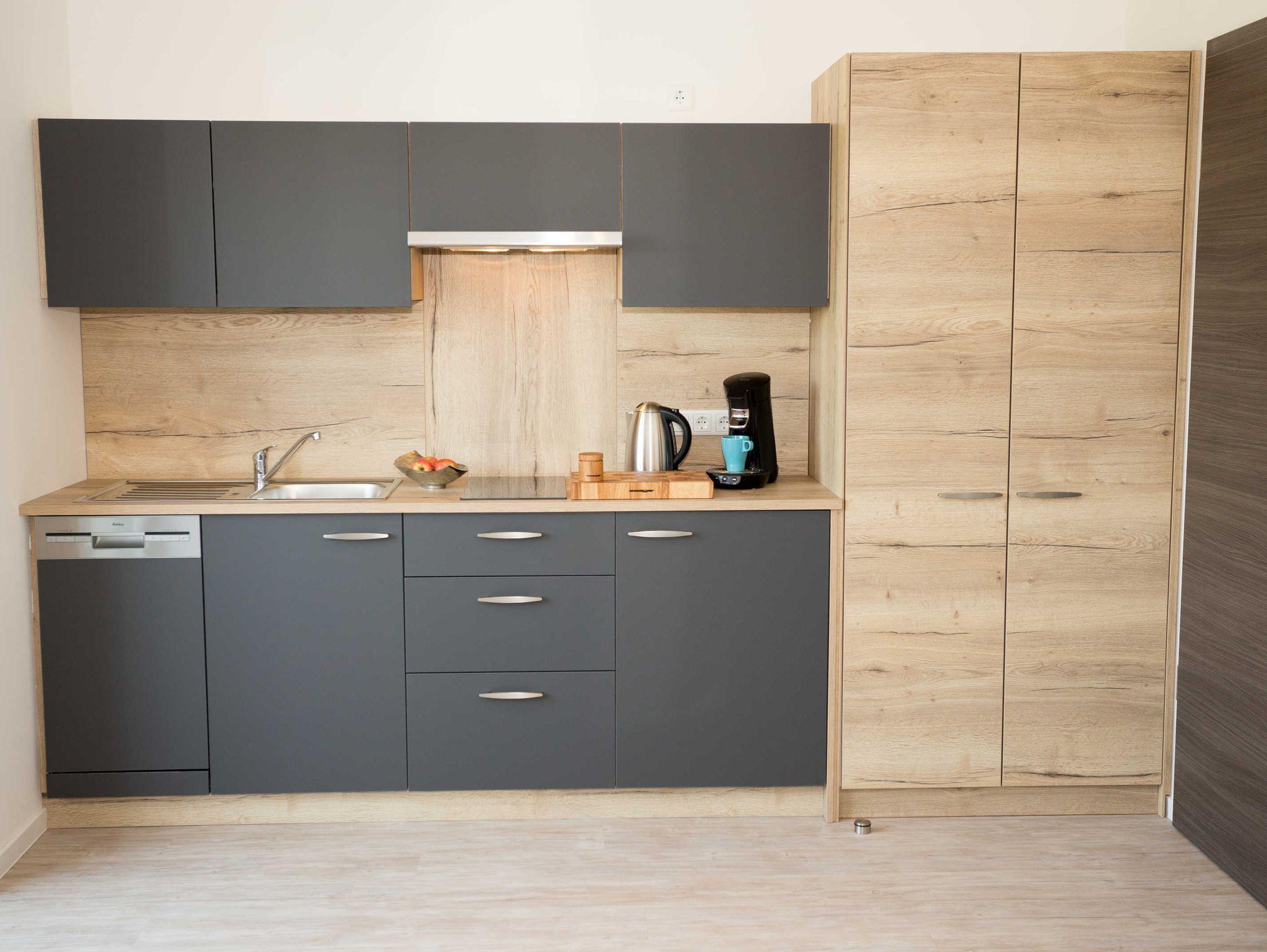 Hochwertig ausgestattetes Penthouse-Apartment mit Dachterrasse. Moderne Einbauküche mit Ceranfeld, Mikrowelle, Toaster, Kaffee-Padmaschine, Wasserkocher, Geschirr, Gläser usw.. Zwei bequeme Sessel mit jeweils einem Fußhocker laden zum verweilen ein . In unseren Box-Springbetten werden Sie himmlisch schlafen.
