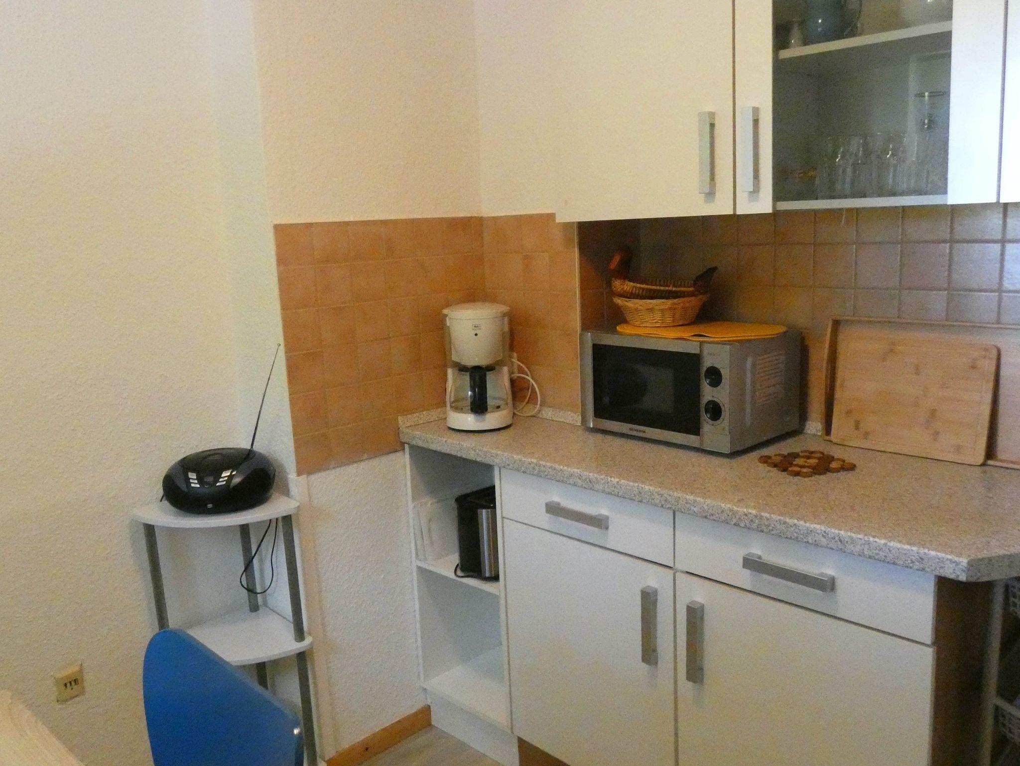 Ein Durchgang vom Wohnzimmer verbindet zur Küche. Die Küche ist mit einer Mikrowelle, einem Kühlschrank mit Gefrierfach, 2 Elektroherdplatten, Kaffeemaschine sowie Eier- und Wasserkocher ausgestattet.