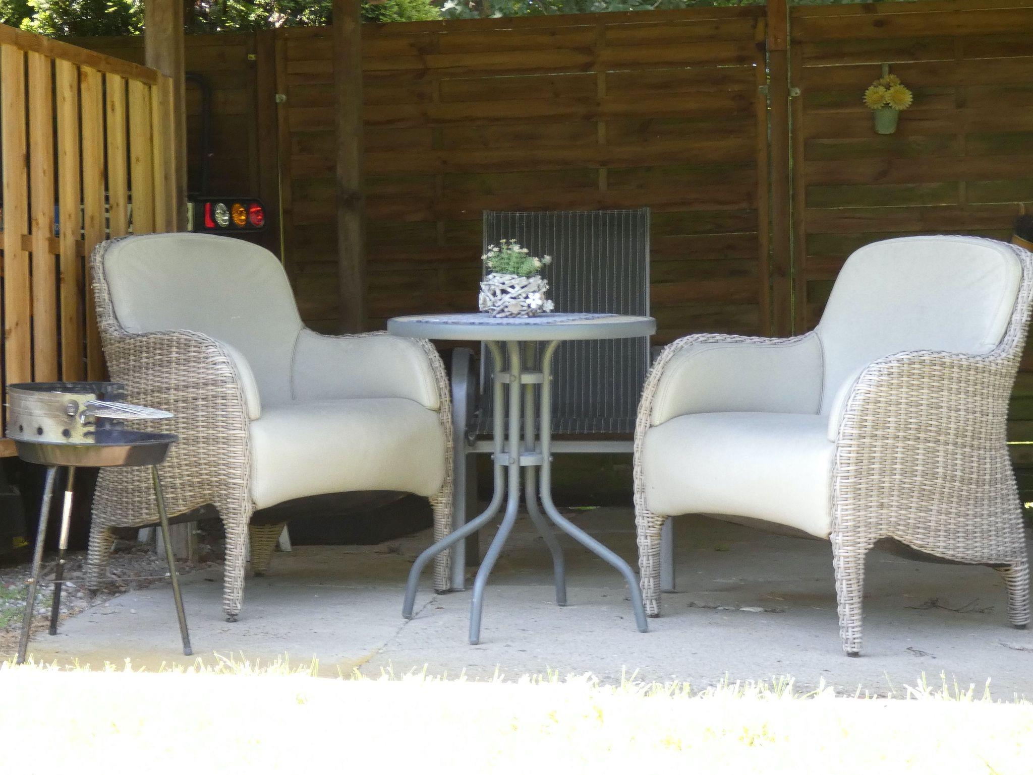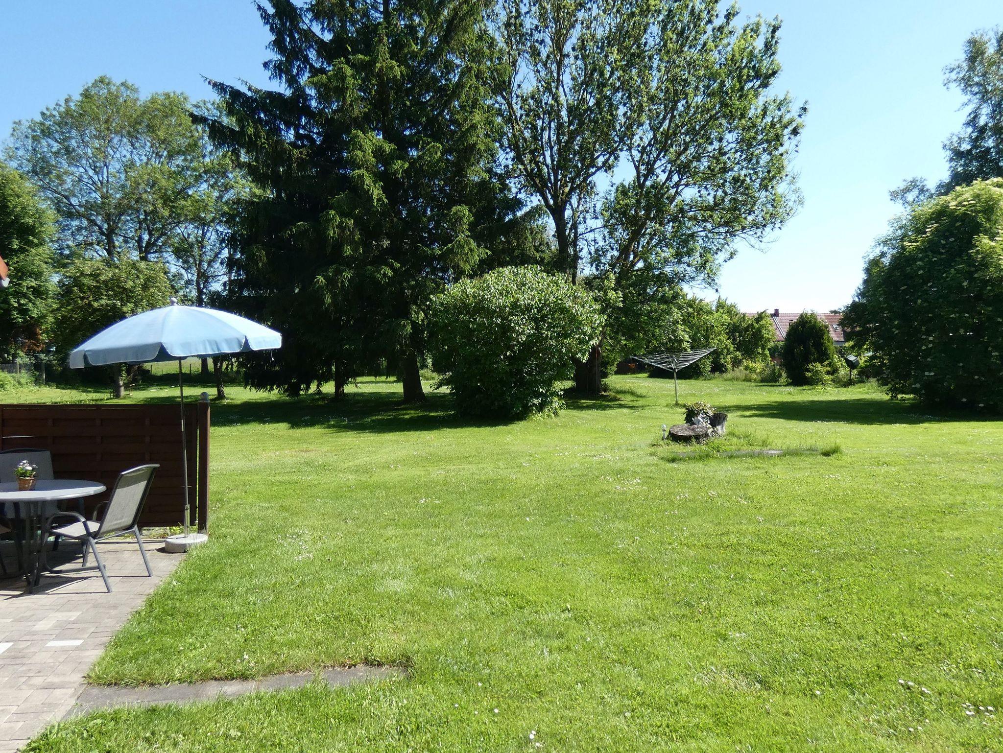 Zur Ferienwohnung gehören eine Terrasse mit Gartenmöbeln sowie ein großer Garten mit Liegewiese.