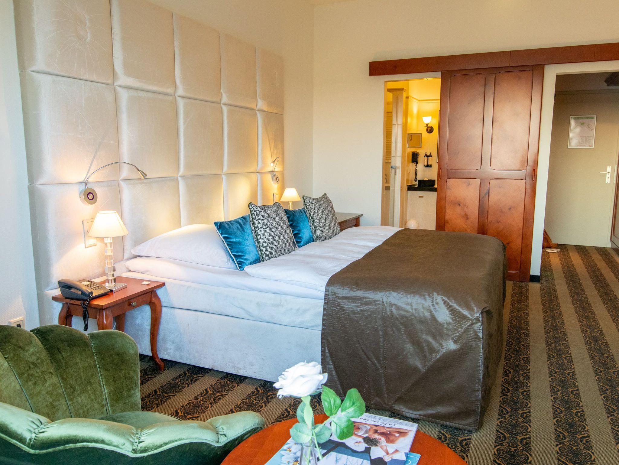 Die stilvollen Doppelzimmer im Van der Valk Resort Hotel Linstow sind wahre Rückzugsorte auf 32 m². Hier erwartet dich eine harmonische Kombination aus zeitgemäßem Komfort und eleganter Atmosphäre. Ein gemütliches Doppelbett (180x200) lädt zum Entspannen ein, während das geräumige Badezimmer mit Dusche und Badewanne Wellnessmomente verspricht. Die Klimaanlage sorgt für ein angenehmes Raumklima und die Nespresso Kaffeemaschine ermöglicht dir, jederzeit einen aromatischen Kaffee zu genießen. Dank der technischen Annehmlichkeiten, wie einem Smart-TV und kostenlosem WLAN, kannst du Arbeit und Entspannung perfekt miteinander verbinden. Weiterhin erwarten dich ein Kühlschrank und ein Safe für deine Wertsachen. Der aufmerksame Service des Hotels rundet dein Erlebnis ab - vom reichhaltigen Frühstücksbuffet über das exquisite Restaurant bis hin zur einladenden Badespaßlandschaft. Hier fühlst du dich sofort wohl und kannst deinen Aufenthalt in vollen Zügen genießen.