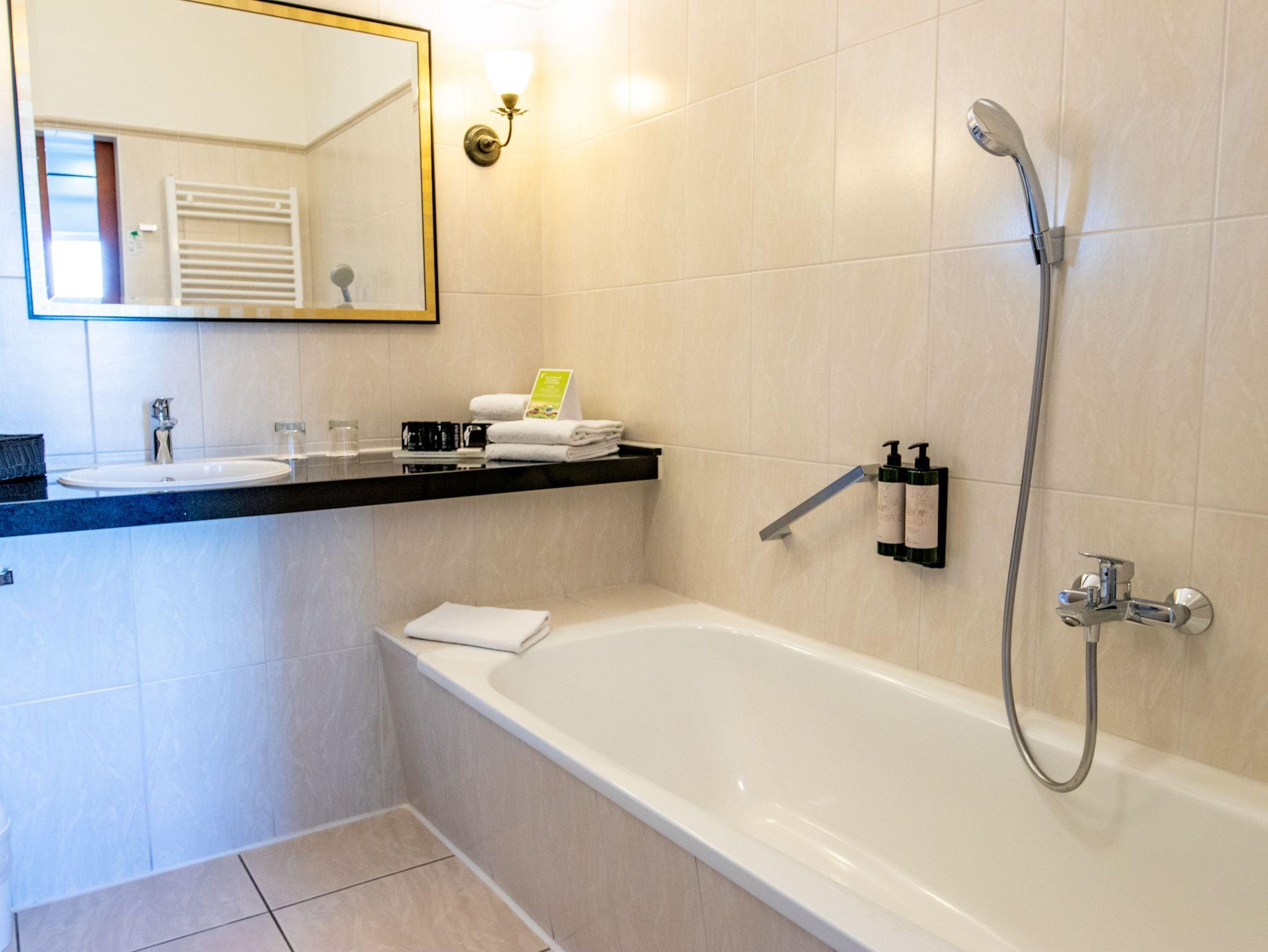 Das Bad bietet dir eine geräumige Dusche, eine Badewanne und einen Haartrockner, sodass es dir an nichts fehlt. Ob du dich nach einem Tag voller Meetings oder nach einem Ausflug in die idyllische Umgebung erfrischen möchtest, hier findest du die passende Wohlfühlatmosphäre. Einige Zimmer sind zusätzlich mit einem Balkon ausgestattet, auf denen du die Ruhe und den Ausblick in die Natur genießen kannst.