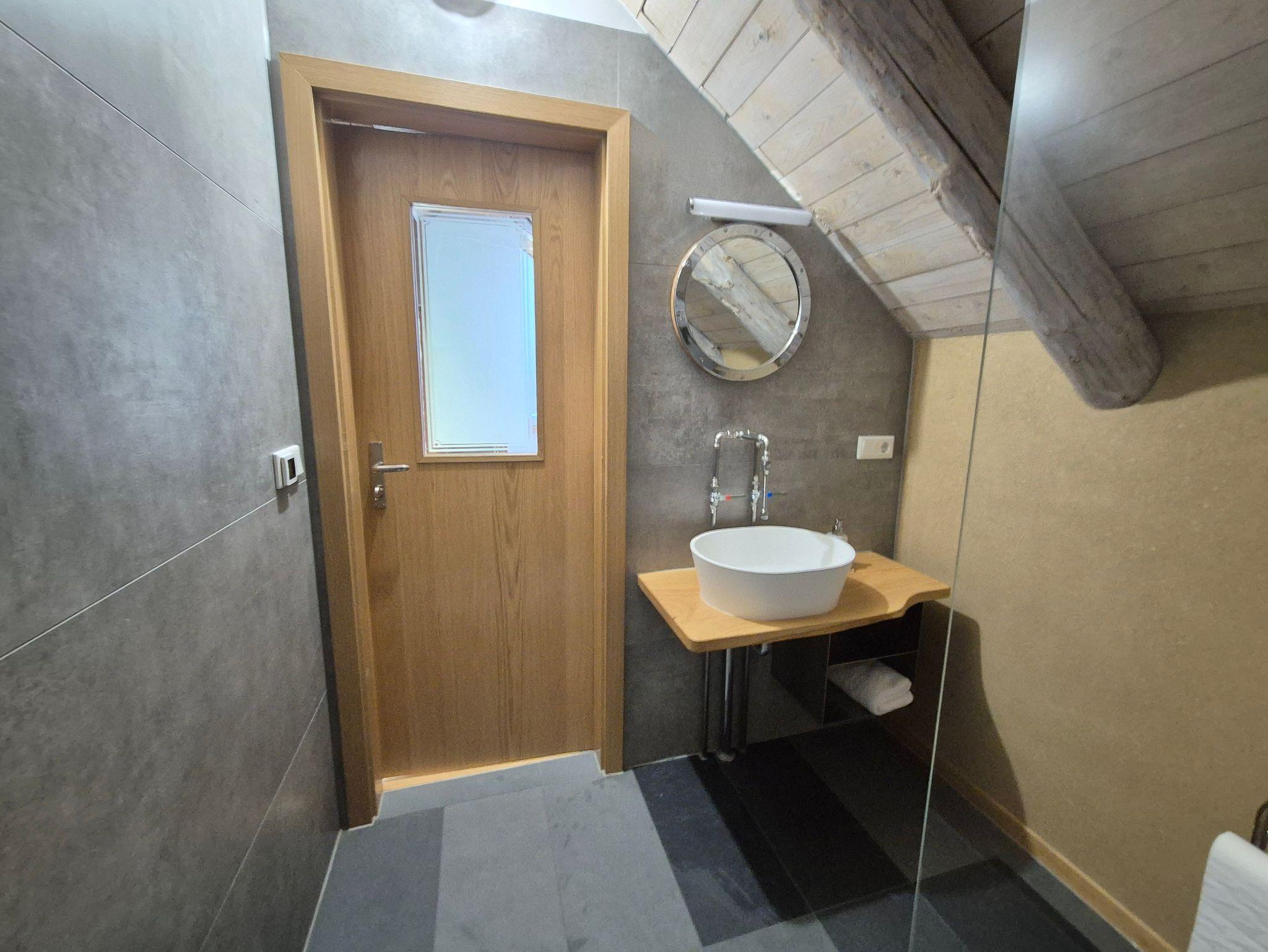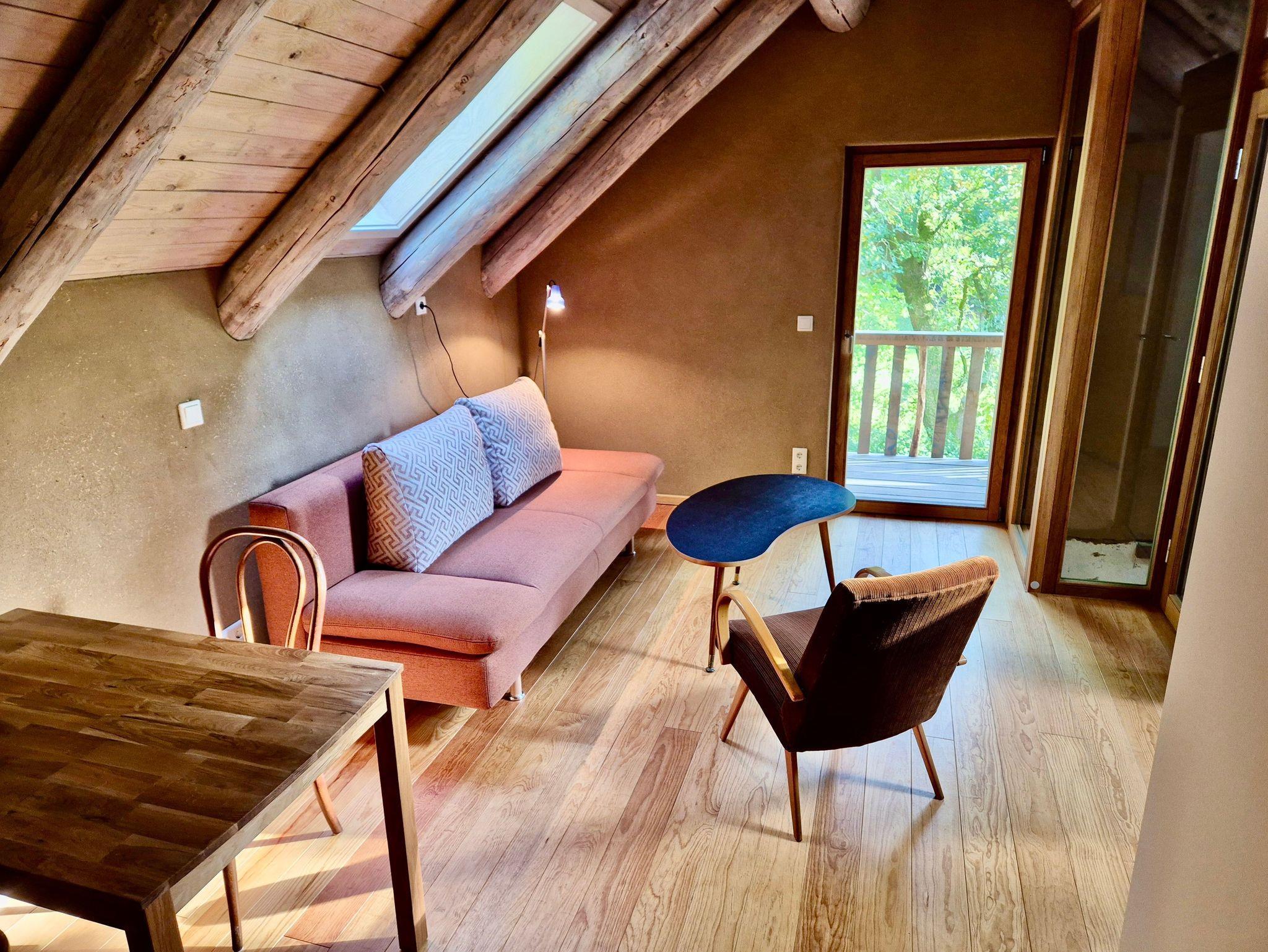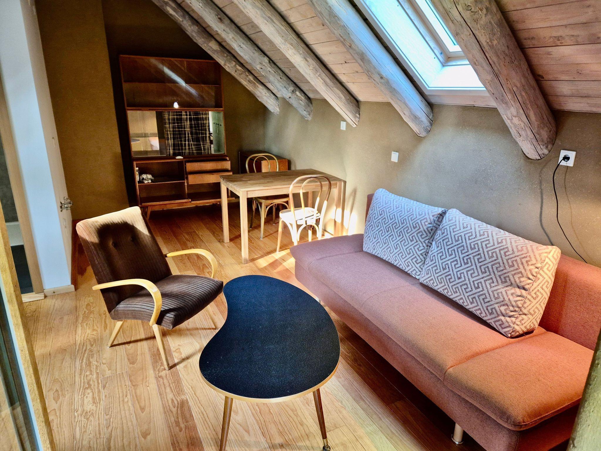 Auf ca. 25 m² erwartet Sie ein gemütlicher Wohnbereich mit Schlafcouch und einem Balkon mit herrlichem Blick ins Grüne, eine Einbauküche sowie ein modernes Badezimmer mit Dusche. Die besonderen Lehmputzwände verleihen der Wohnung ein warmes, natürliches Ambiente.