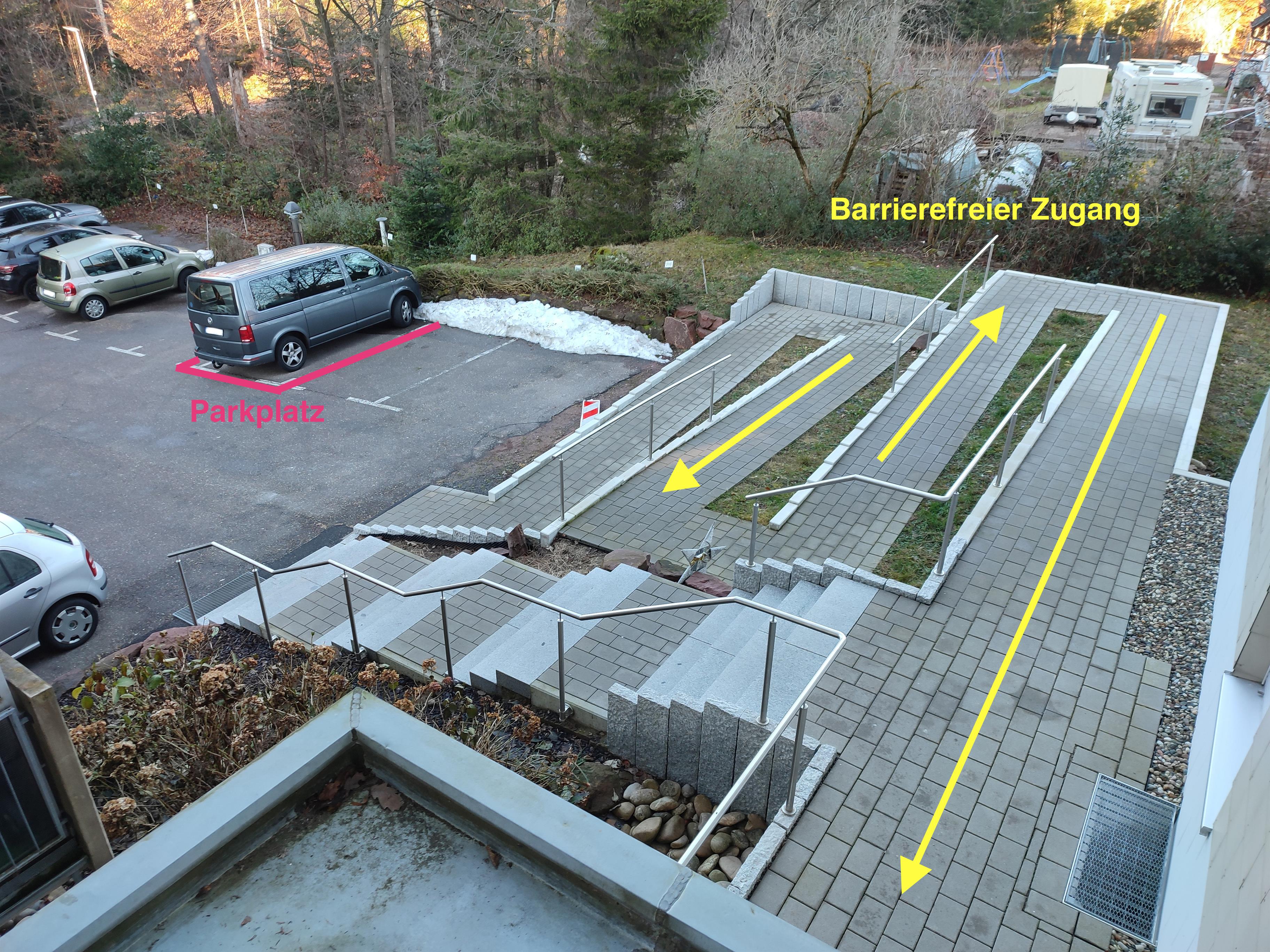 Der zur Wohnung gehörige PKW-Parkplatz ist nah am Hauseingang. Der Zugang zum Hauseingang über die Treppe oder die barrierefreie Rampe zum Fahrstuhl oder Treppenhaus. Sperriges kann leicht über die Rampe und dem Fahrstuhl in die Wohnung transportiert werden.