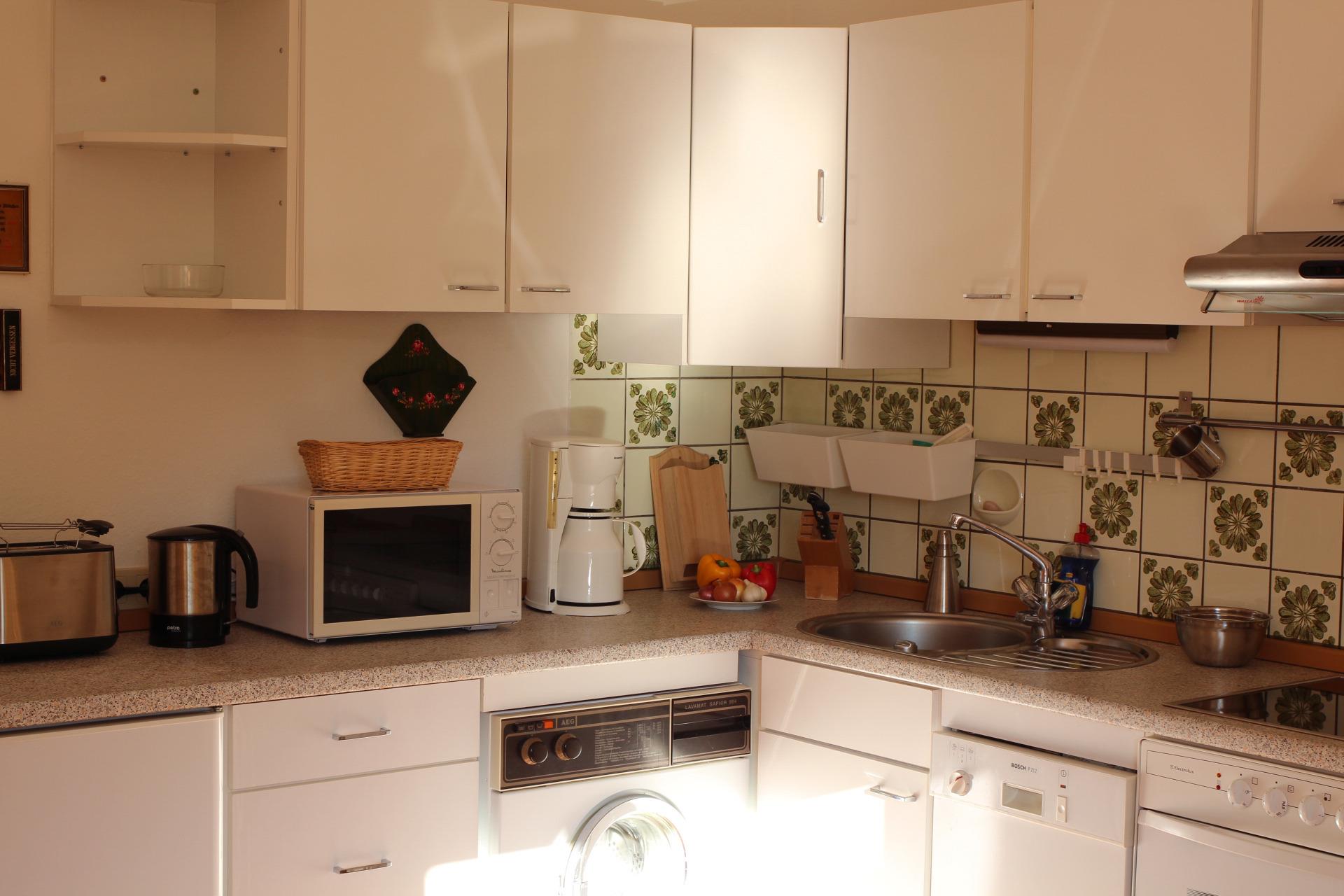 Küche (Einbauküche mit Herd, Spülmaschine und Waschmaschine) Bad (Badewanne, Toilette und Waschbecken), Gäste-WC (Toilette und Waschbecken), Süd-Balkon.