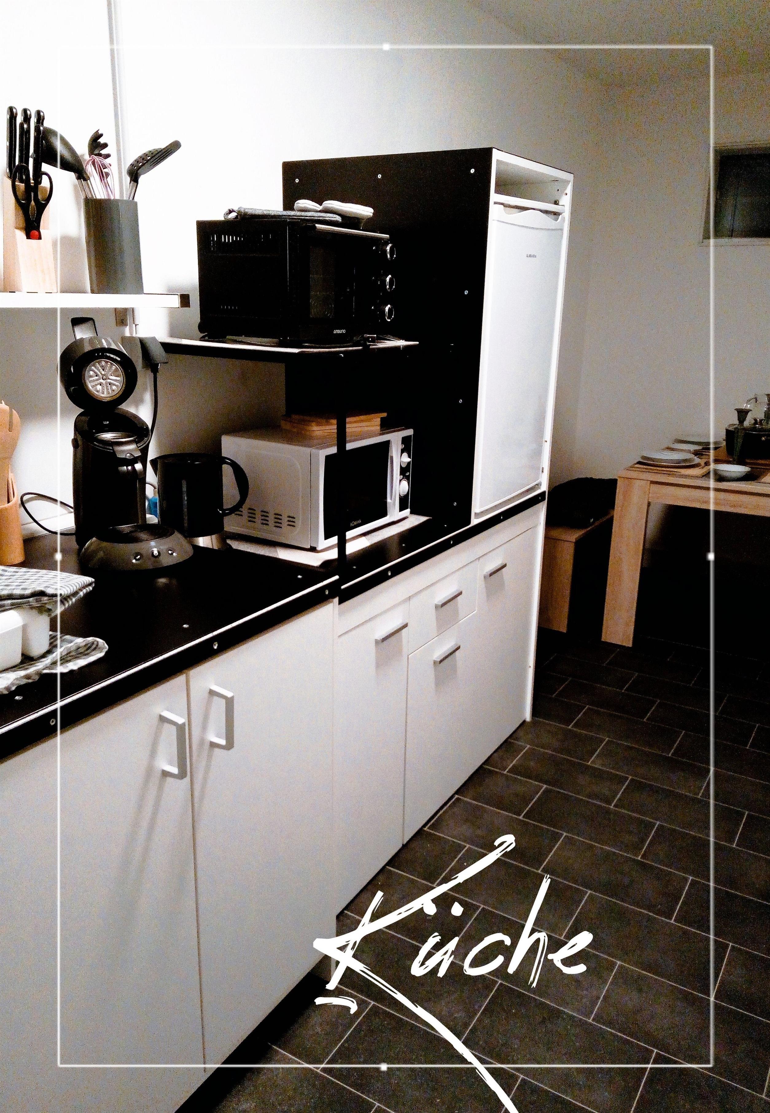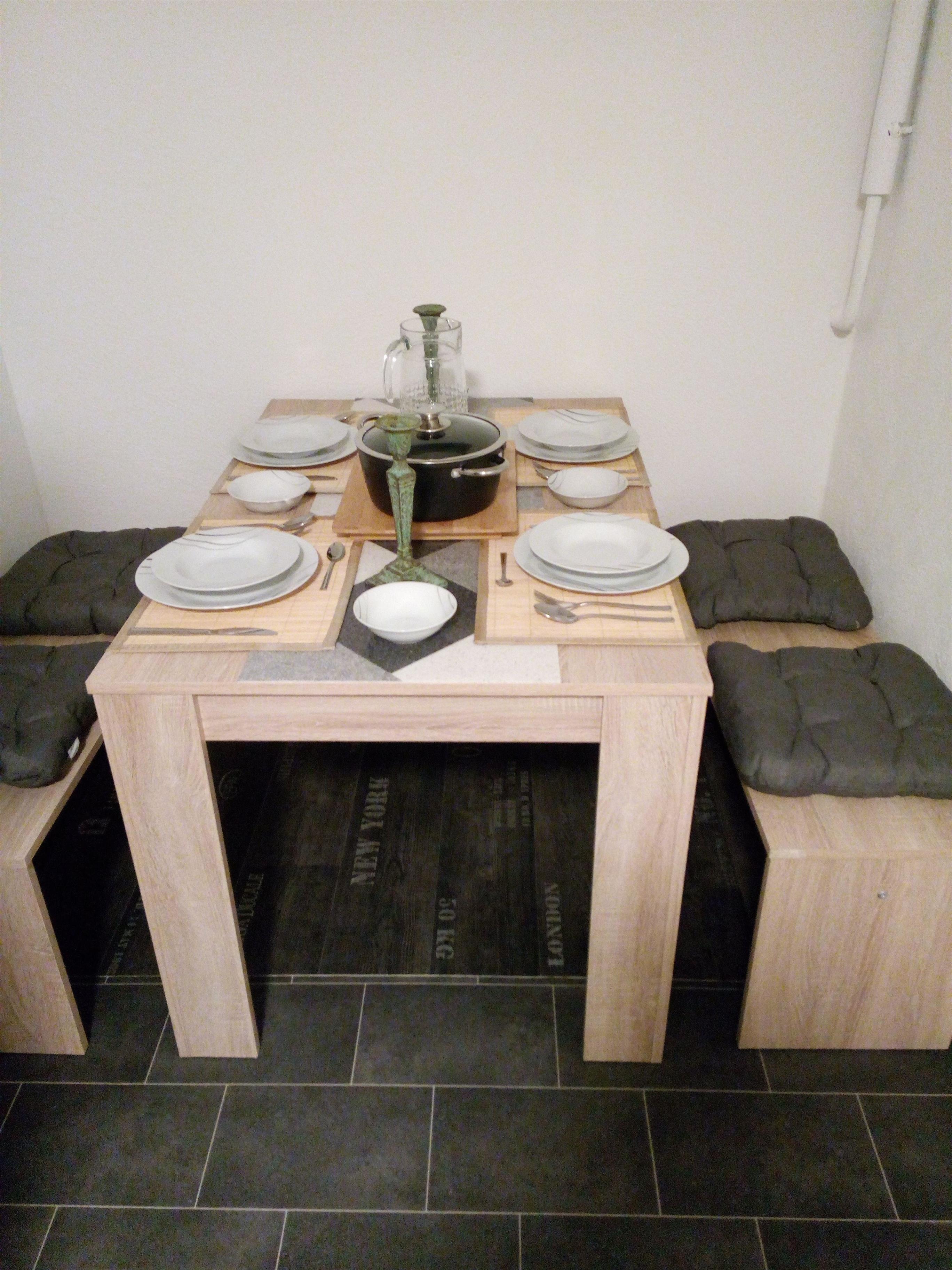 Küche mit Esstisch für max. 4 Personen und Küchenzeile. Ausstattung mit Geschirr, Kochplatte, Kleiner Backofen, Microwelle, Heißluftfritteuse, Wasserkocher und Kaffeemaschine. Wohnzimmer hell mit einem Sideboard, einem Tisch mit 2 Stühlen, 2 Sessel, Couchtisch und einem Schlafsofa mit Bettkasten (Schlaffunktion 140x200),kleines Radio und TV.